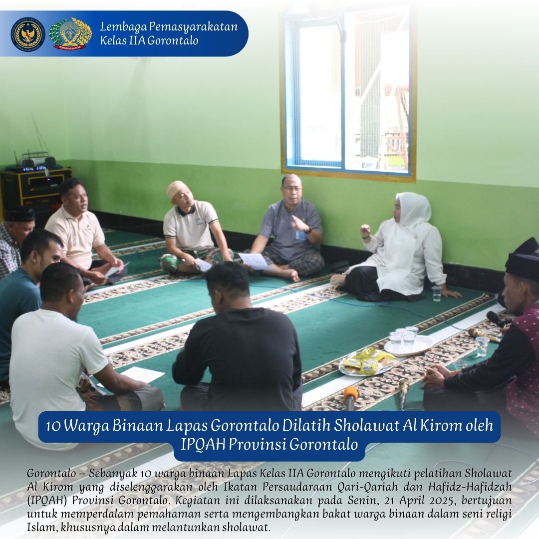 Gorontalo _ Selasa (22/04) bertempat diselasar Masjid At-Taubah, tampak warga binaan Lapas Kelas IIA Gorontalo tekun mengikuti pelatihan Sholawat Al Kirom yang diselenggarakan oleh Ikatan Persaudaraan Qari-Qariah dan Hafidz-Hafidzah (IPQAH) Provinsi Gorontalo, Kasdin Lato selaku Kasibinadik Lapas Gorontalo saat ditemui awak media menyampaikan bahwa kegiatan ini adalah salah satu program pembinaan yang akan diikuti oleh warga binaan yang beragama Islam, walaupun tidak semuanya, namun yang paling penting adalah bagaimana kami bisa menanamkan kecintaan kepada Rasulullah SAW, ujar Kasdin yang lebih lanjut menyampaikan bahwa Sholawat Nabi Muhammad adalah bentuk penghormatan dan doa bagi Rasulullah SAW, yang telah menjadi teladan sempurna bagi umat Islam. Sholawat bukan hanya ungkapan cinta dan rindu, tetapi juga sarana untuk mendekatkan diri kepada Allah SWT. Mari kita telaah bersama bacaan sholawat dan maknanya, sambil merenungkan keindahan dan kecemerlangan cahaya ilahi yang disampaikan melalui sholawat.