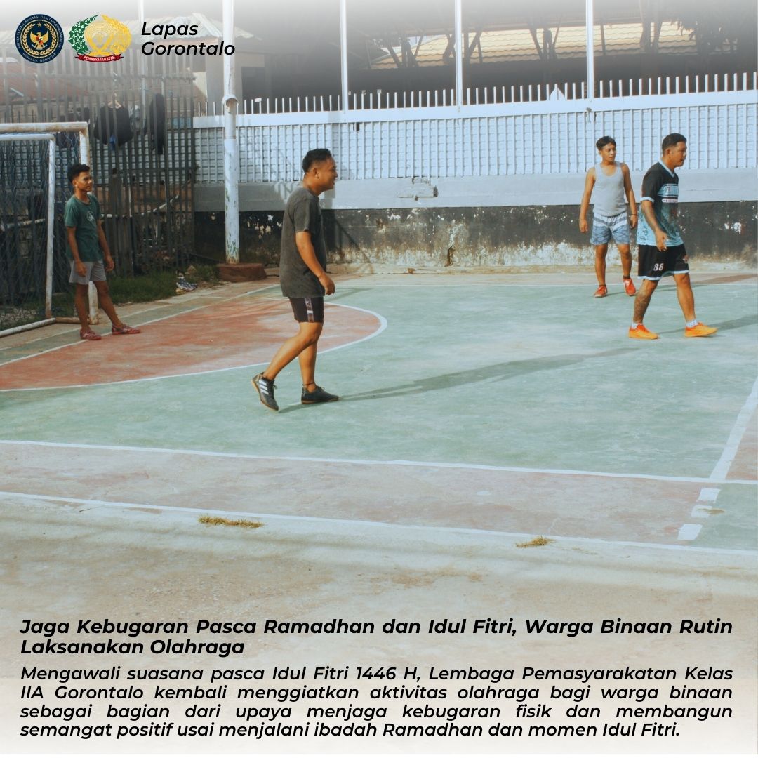 Gorontalo_ Selasa (08/04) – Mengawali suasana pasca Idul Fitri 1446 H, Lembaga Pemasyarakatan Kelas IIA Gorontalo kembali menggiatkan aktivitas olahraga bagi warga binaan sebagai bagian dari upaya menjaga kebugaran fisik dan membangun semangat positif usai menjalani ibadah Ramadhan dan momen Idul Fitri.