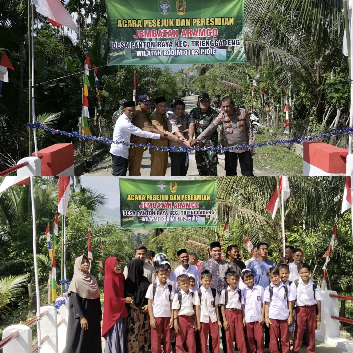 Pidie Jaya — Harapan masyarakat akhirnya terwujud. Jembatan Aramco yang menghubungkan Desa Panton Raya dengan Desa Tampui, Kecamatan Trenggadeng, Kabupaten Pidie Jaya, resmi dibuka untuk umum. Peresmian ditandai dengan prosesi peusijuek (tepung tawar) dan pemotongan pita oleh unsur Muspika setempat di lokasi jembatan, Desa Panton Raya, Senin (27/04/2026).