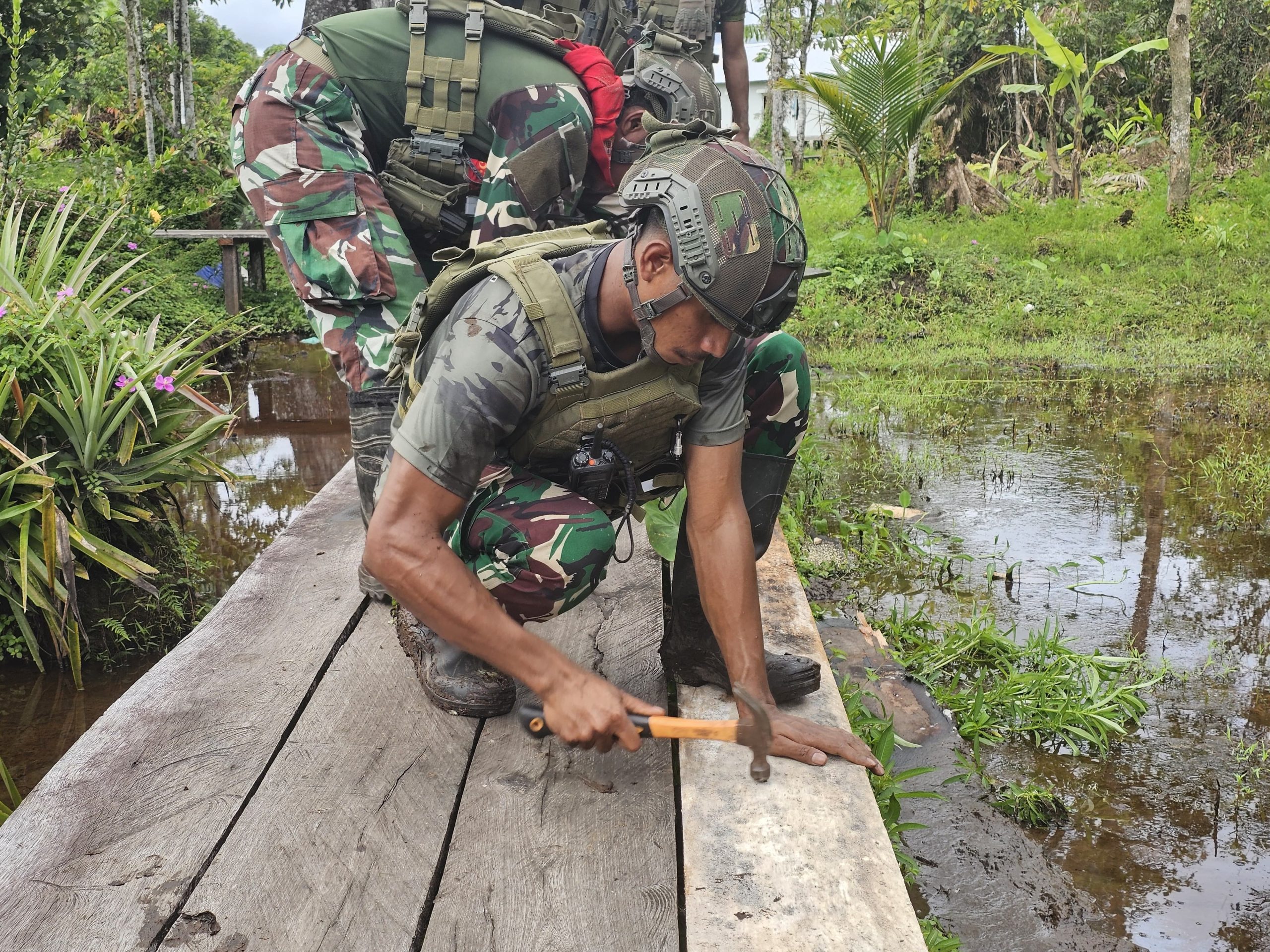 Melihat kondisi tersebut, personel Satgas Pamtas Mobile Yonif 733/Masariku yang bertugas di Titik Kuat Batas Batu berinisiatif untuk melakukan perbaikan. Dengan peralatan seadanya dan semangat gotong royong, para prajurit TNI bahu-membahu memperbaiki jembatan tersebut.