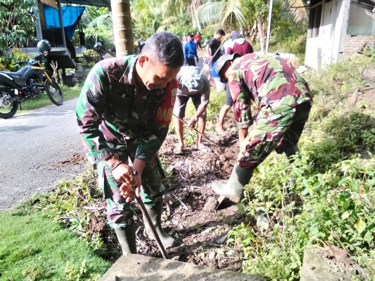 Enrekang — Anggota Koramil 1419-02/Enrekang bersama warga melaksanakan karya bakti pembersihan selokan dari tanah, rumput dan sampah lainnya sepanjang 150 meter di Lingk. Bisang Kel. Lewaja Kec. Enrekang Kab. Enrekang, Jumat 04/07/2025