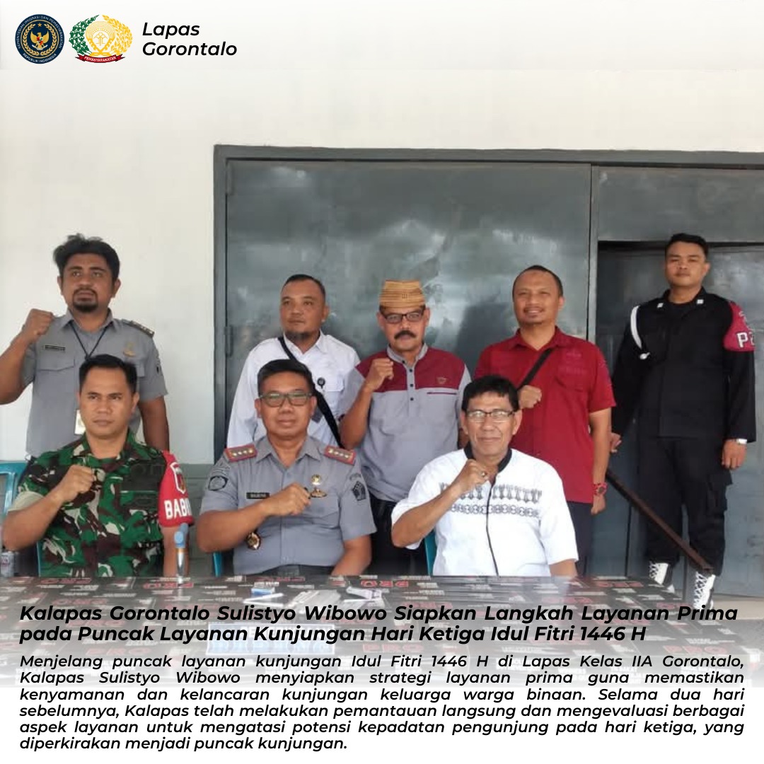 Dengan berbagai langkah progresif yang telah disiapkan, Lapas Kelas IIA Gorontalo siap menyambut ribuan pengunjung pada puncak layanan kunjungan hari ketiga Idul Fitri 1446 H, dengan harapan setiap keluarga yang datang dapat menikmati momen kebersamaan dengan nyaman dan penuh kebahagiaan.