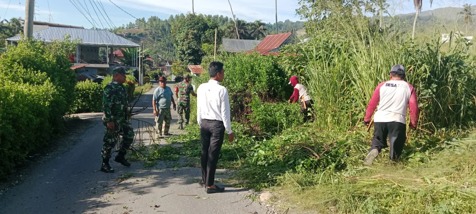 Babinsa bersama warga bergotong royong membersihkan sisi kiri dan kanan jalan guna menciptakan lingkungan yang bersih, rapi, dan aman bagi pengguna jalan. Kegiatan ini juga menjadi sarana mempererat hubungan silaturahmi serta meningkatkan kemanunggalan TNI dengan rakyat.
