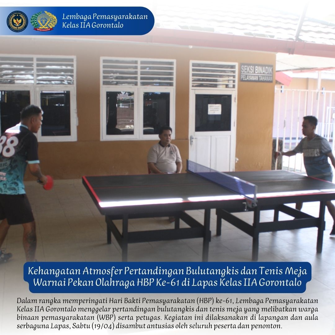 Gorontalo – Dalam rangka memperingati Hari Bakti Pemasyarakatan (HBP) ke-61, Lembaga Pemasyarakatan Kelas IIA Gorontalo menggelar pertandingan bulutangkis dan tenis meja yang melibatkan warga binaan pemasyarakatan (WBP) serta petugas. Kegiatan ini dilaksanakan di lapangan dan aula serbaguna Lapas, Sabtu (19/04) disambut antusias oleh seluruh peserta dan penonton.