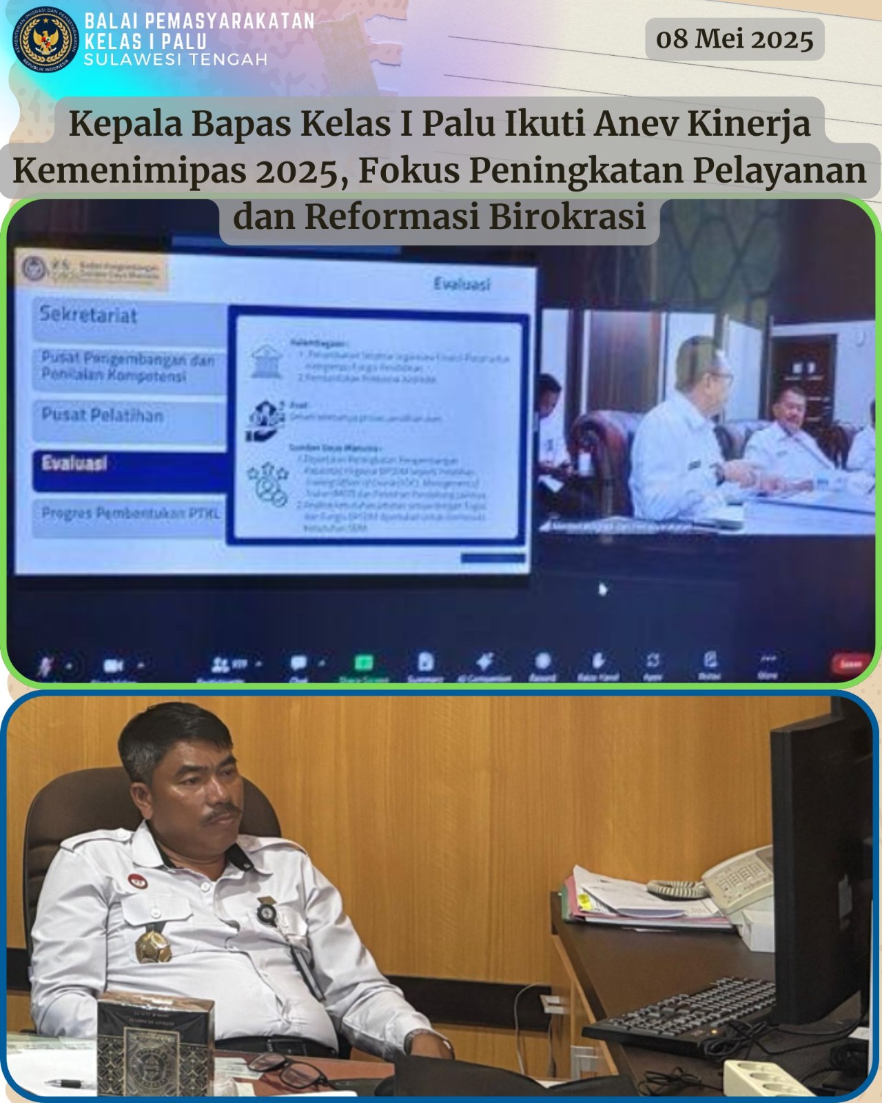 Palu, Sulawesi Tengah – Kepala Balai Pemasyarakatan (Bapas) Kelas I Palu, Kantor Wilayah Direktorat Jenderal Pemasyarakatan (Ditjenpas) Sulawesi Tengah, Hasrudin, turut serta dalam kegiatan penting Analisis dan Evaluasi (Anev) Kinerja Kementerian Imigrasi dan Pemasyarakatan (Kemenimipas) Tahun 2025. Forum evaluatif yang diselenggarakan pada Rabu (7/5) ini bertujuan untuk mengukur pencapaian kinerja selama semester pertama tahun 2025, mengidentifikasi kendala yang dihadapi, serta merumuskan strategi perbaikan dan inovasi untuk meningkatkan kualitas pelayanan di sektor keimigrasian dan pemasyarakatan secara komprehensif.