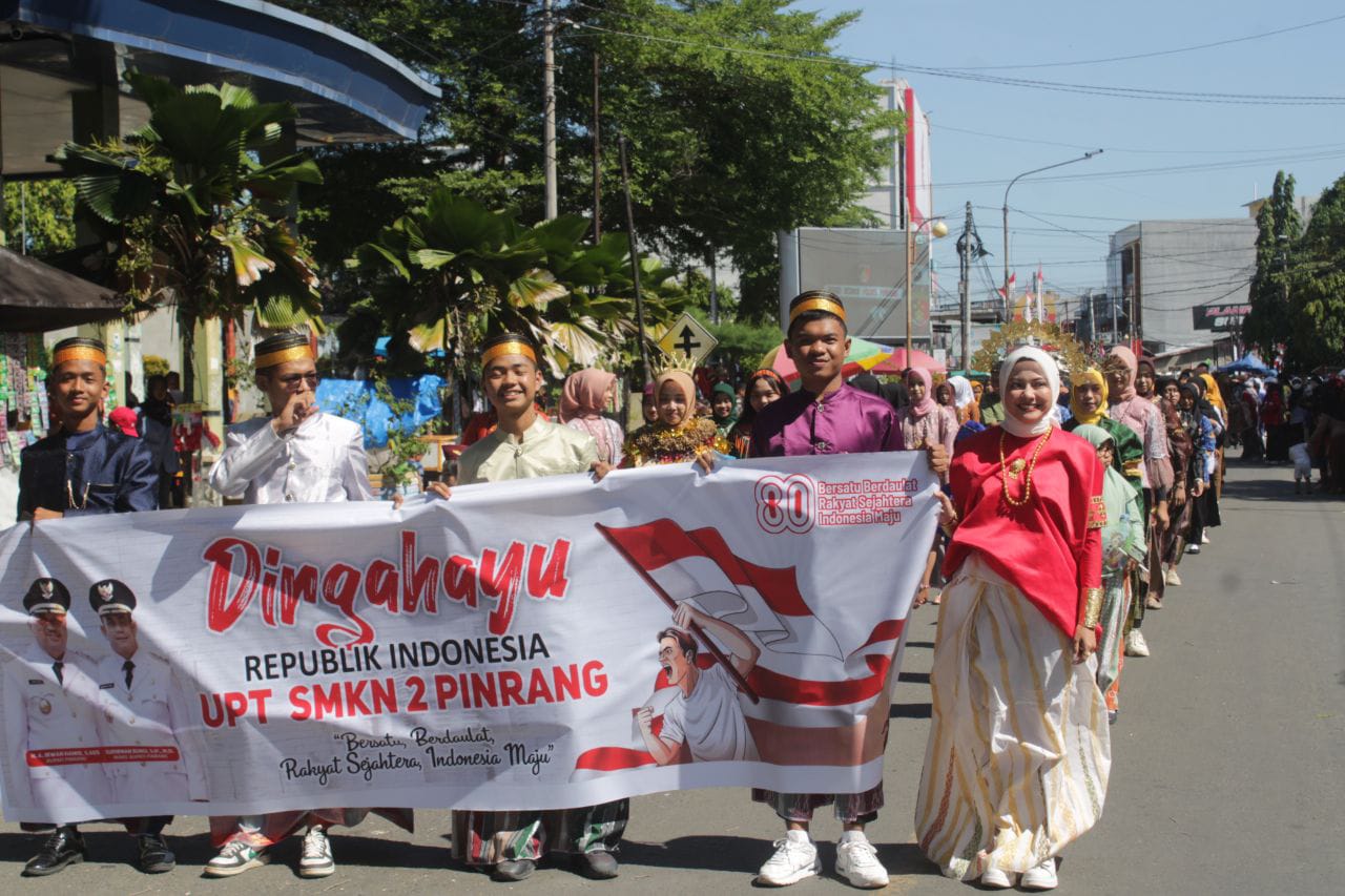 Karnaval yang diikuti oleh ribuan peserta dari berbagai sekolah di Kabupaten Pinrang ini menampilkan keberagaman kostum yang sarat makna, mulai dari busana adat daerah hingga pakaian profesi, mencerminkan kekayaan budaya sekaligus semangat kebhinekaan.