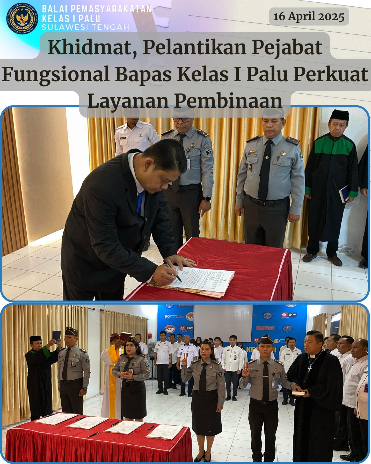 Pelantikan ini secara langsung dilakukan oleh Kepala Kantor Wilayah Direktorat Jenderal Pemasyarakatan (Ditjenpas) Sulawesi Tengah. Keempat pejabat yang dilantik terdiri dari dua Pembimbing Kemasyarakatan Ahli Muda dari Bapas Kelas I Palu, yakni Ibu Niluh Indah Pratiwi dan Bapak Alfred Noval. Selain itu, dilantik pula Bapak Andri Syafrizal sebagai Pembimbing Kemasyarakatan Ahli Muda dan Ibu Yuliarty Fitri Kalintabu sebagai Asisten Pembimbing Kemasyarakatan Mahir, keduanya berasal dari Bapas Kelas II Luwuk.