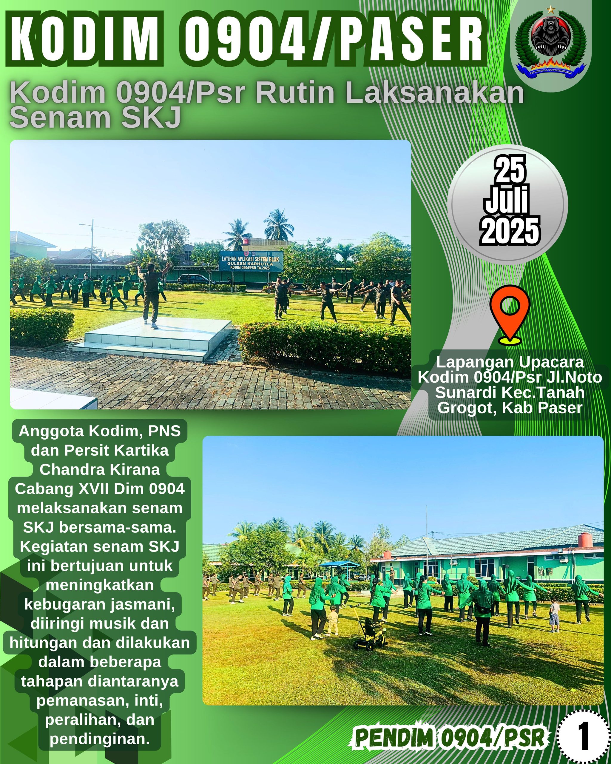 Kodim 0904/Psr, Korem 091/ASN, Kodam VI/Mlw – Bertempat di lapangan Upacara Kodim 0904/Psr Jl.Noto Sunardi Kec.Tanah Grogot, Kab Paser, Anggota Kodim, PNS dan Persit Kartika Chandra Kirana Cabang XVII Dim 0904 melaksanakan senam SKJ bersama-sama.
