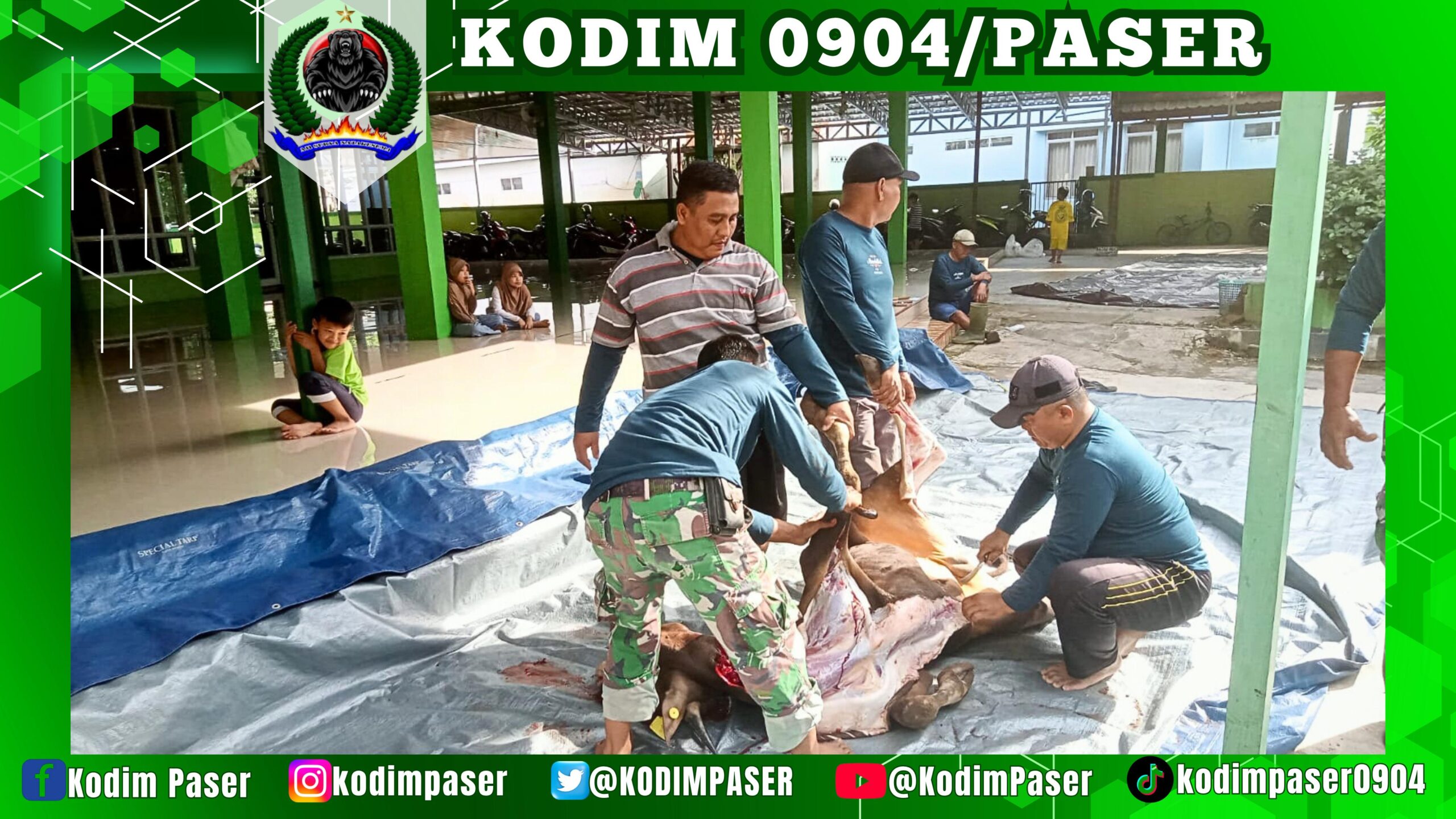 Kodim 0904/Psr, Korem 091/ASN, Kodam VI/Mlw – Dalam rangka merayakan Hari Raya Idul Adha 10 Dzulhijjah 1446 H/2025 M, Komandan Kodim 0904/Psr, Letnan Kolonel Inf. Rommy Aditya Nanda Erlambang Eretan Situlembang Darmawi, S.E., M.I.P.. bersama Prajurit Kodim 0904/Psr melaksanakan kegiatan penyembelihan dan pembagian hewan kurban yang dilaksanakan pada hari Sabtu tanggal 7 Juni 2025 bertempat di Halaman Masjid Al-Muttaqim Kodim 0904/Psr, Jl. Anden Oko, Kec. Tanah Grogot, Kab. Paser. Sabtu (7/6/2025)