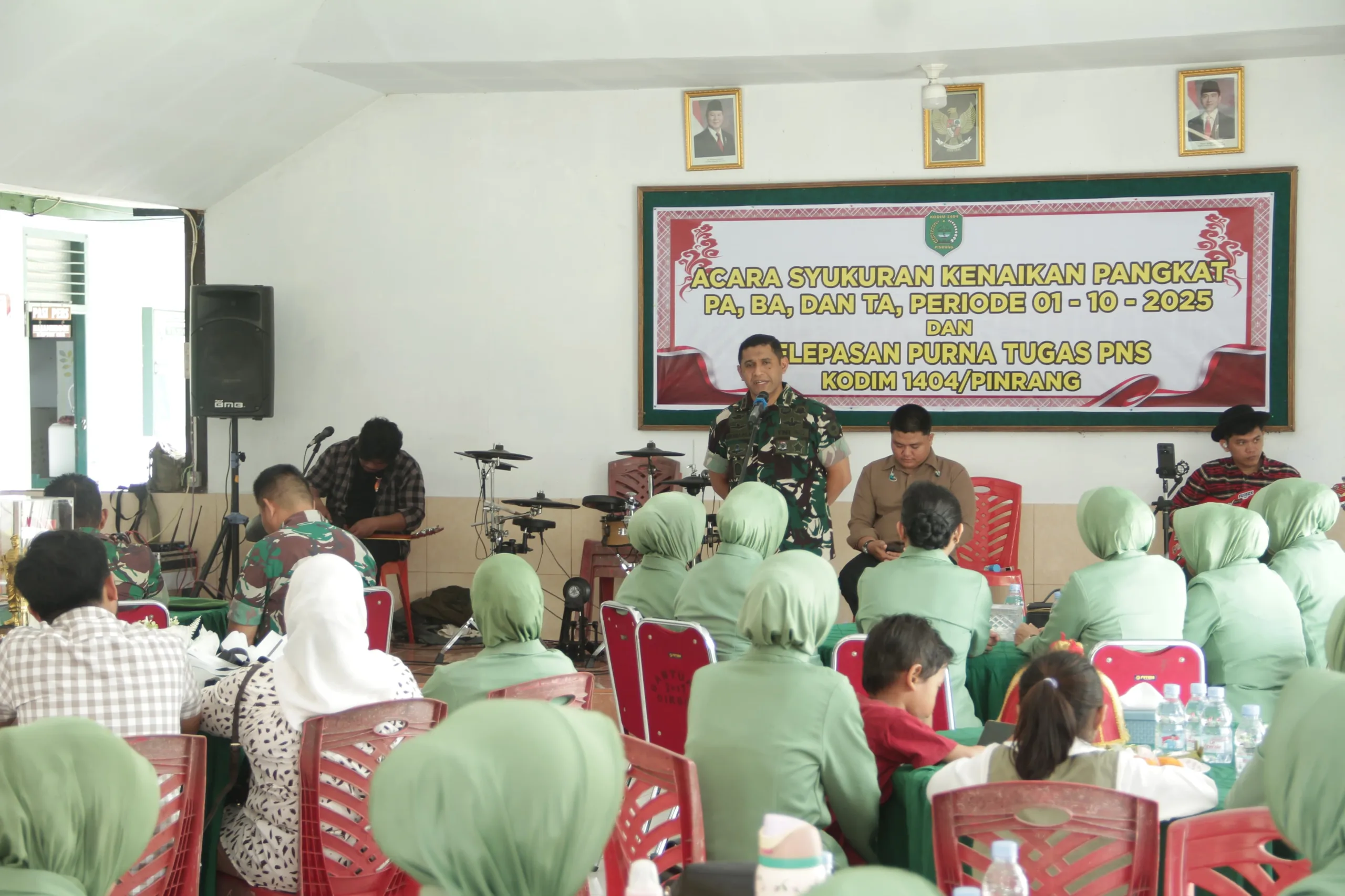 Pinrang_ Kodim 1404/Pinrang menggelar acara syukuran kenaikan pangkat bagi Perwira, Bintara, dan Tamtama, sekaligus pelepasan Pegawai Negeri Sipil (PNS) yang memasuki masa purna tugas, bertempat di Pendopo Makodim 1404 Pinrang, Kelurahan Laleng Bata, Kecamatan Paleteang, Kabupaten Pinrang, Sabtu (11/10/2025).