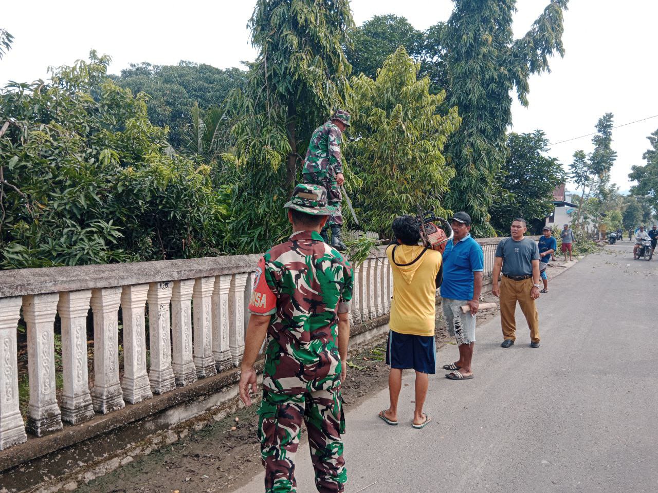 Pinrang_ Untuk menjaga keamanan pengendara, Babinsa Koramil-06 Kodim 1404/Pinrang berkolaborasi dengan Staf Desa dan warga setempat melaksanakan kerja bakti pembersihan ranting-ranting pohon yang mengganggu pengguna jalan di Dusun Batri Desa Kaballangan Kecamatan Duampanua Kabupaten Pinrang, Senin (21/04/2025).