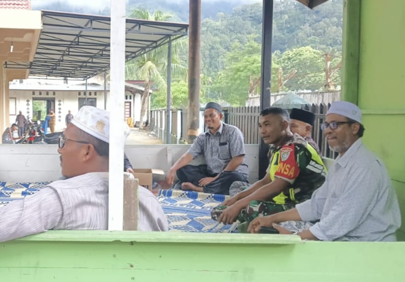 Pidie – Bintara Pembina Desa (Babinsa) Koramil 16/Tangse, Kodim 0102/Pidie, Serda Iskandar, menggelar kegiatan komunikasi sosial (Komsos) bersama tokoh agama dan tokoh masyarakat di Desa Peunalom II, Kecamatan Tangse, Kabupaten Pidie, pada Minggu (28/9/2025).