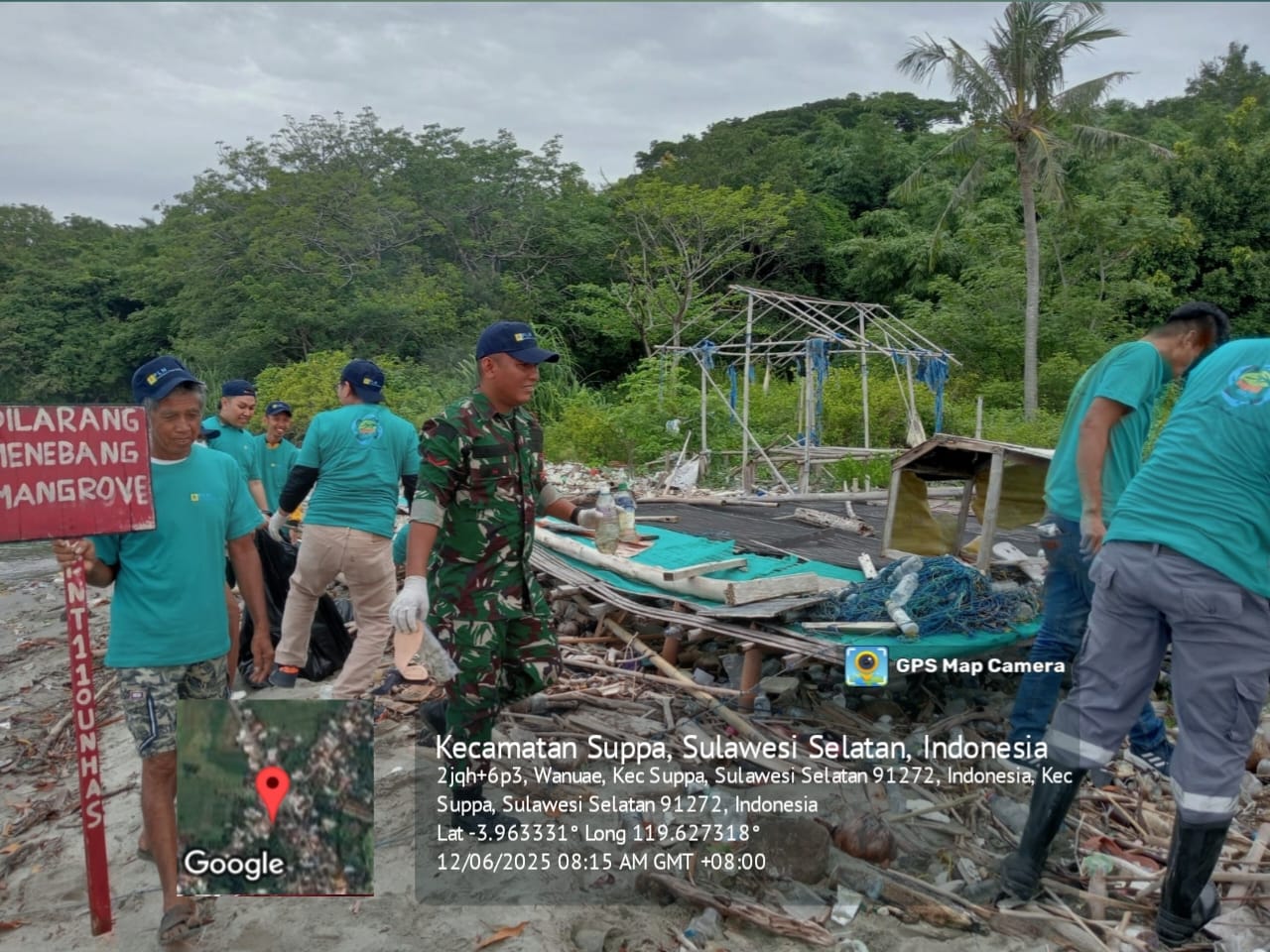 Pinrang_ Peduli kebersihan Lingkungan, Koramil-01/Suppa bersama Forkopimcam dan stake holder terkait lainnya dan warga setempat mengadakan kegiatan kerja bakti pembersihan pesisir pantai Marabombang di Lingkungan Wanuae Kelureahan Watang Suppa Kecamatan Suppa Kabupaten Pinrang, Jum’at (13/06/2025).