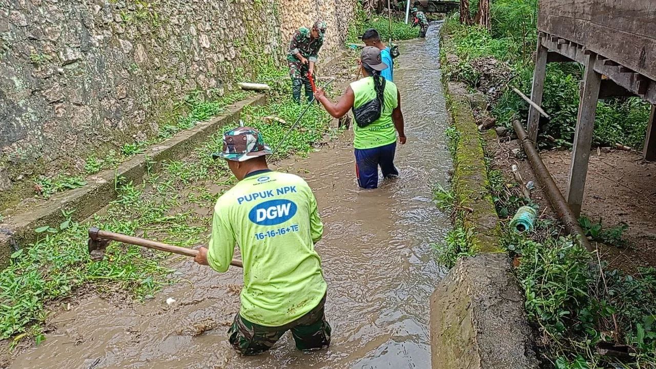 Enrekang _ Anggota Koramil 1419-03/Baraka Kodim 1419/Enrekang yang dipimpin oleh Peltu Arsyad bersama masyarakat Melaksanakan karya bakti pembersihan Dreinase dari tanah, rumput dan sampah lainnya dalam rangka mengantisipasi terjadinya luapan air di Dusun Kalepe Desa Eran Batu Kec. Buntu Batu kab. Enrekang, Jumat (10/10/2025).