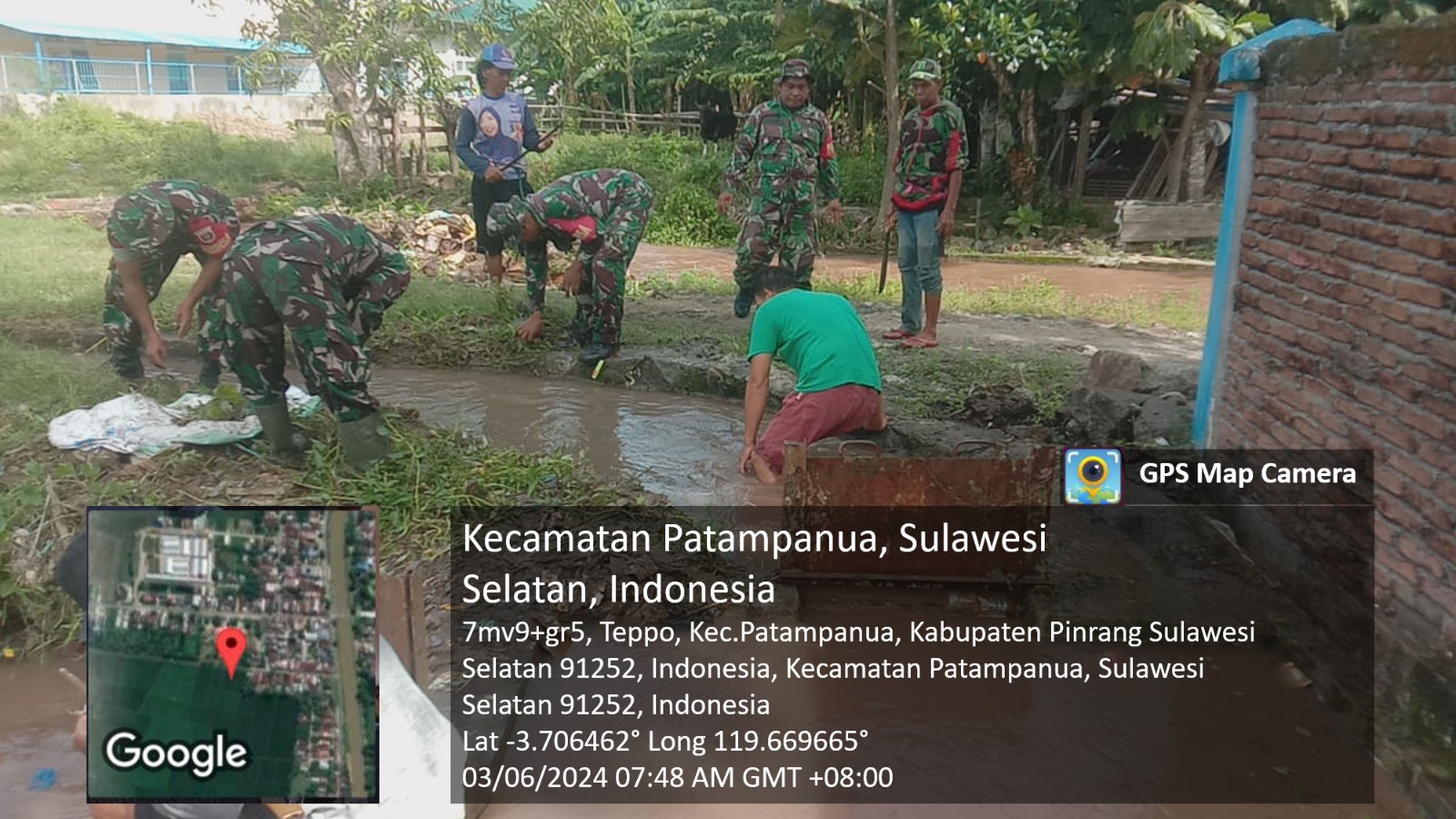 Pinrang_ Untuk memperlancar air mengairi persawahan petani, Babinsa jajaran Koramil-05/Patampanua Kodim 1404/Pinrang melaksanakan kerja bakti pembersihan saluran irigasi di Kelurahan Teppo Kecamatan Patampanua Kabupaten Pinrang, Selasa (03/06/2025).