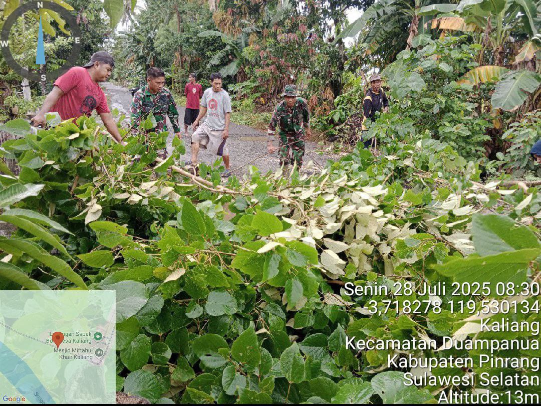 Pinrang_ Babinsa Koramil-06/Duampanua Kodim 1404/Pinrang melaksanakan kerja bakti pembersihan lingkungan yaitu memotong dahan dan ranting pohon yang ada di sepanjang jalan Desa Kaliang Kecamatan Duampanua Kabupaten Pinrang, Senin (28/070/2025).