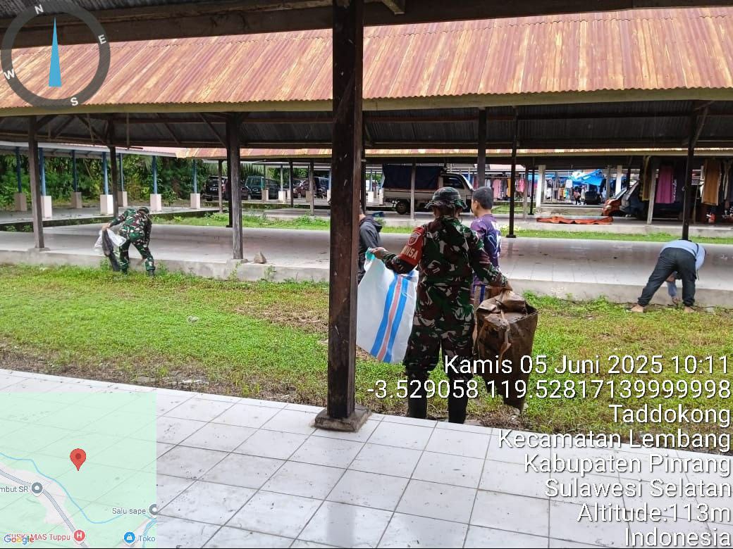 Pinrang_ Peduli terhadap kebersihan Lingkungan, Babinsa Koramil-07/Lembang Kodim 1404/Pinrang beserta warga melaksanakan aksi pembersihan pasar Tuppu di Kelurahan Tadokkong Kecamatan Lembang Kabupaten Pinrang, Kamis (05/06/2025).