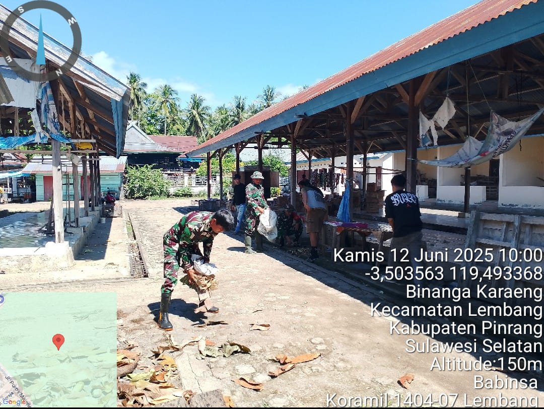 Pinrang_ Dalam rangka menjaga kebersihan di wilayah binaan, Anggota Koramil-07/Lembang Kodim 1404/Pinrang bersama warga melaksanakan pembersihan pasar tradisional di Desa Binanga Karaeng Kecamatan Lembang Kabupaten Pinrang, Kamis (12/06/2025).