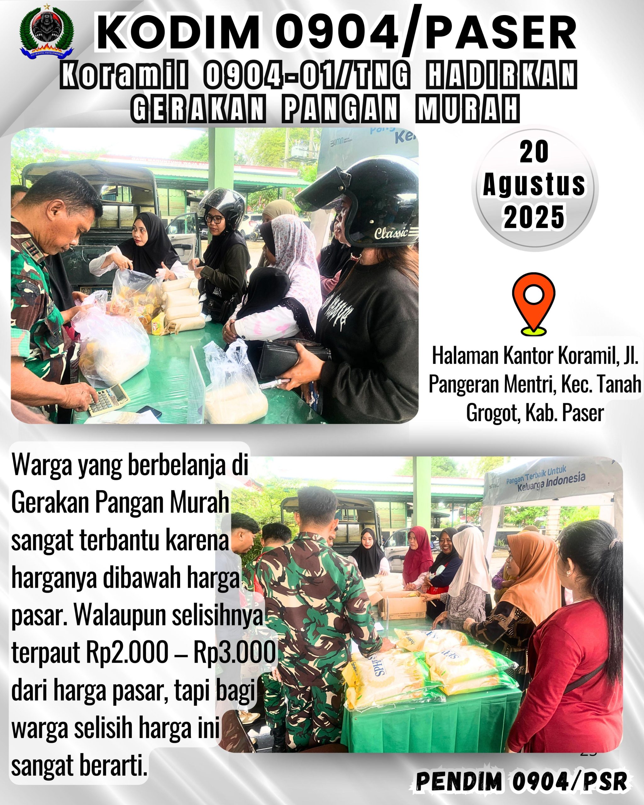 Kodim 0904/Paser, Korem 091/ASN, Kodam VI/Mlw – Bertempat di halaman Koramil 0904-01/Tanah Grogot Kec. Tanah Grogot, Kab. Paser Koramil 0904-01/Tanah Grogot beserta Bulog menggelar Gerakan Pangan Murah(GPM), Rabu (20/8/2025)