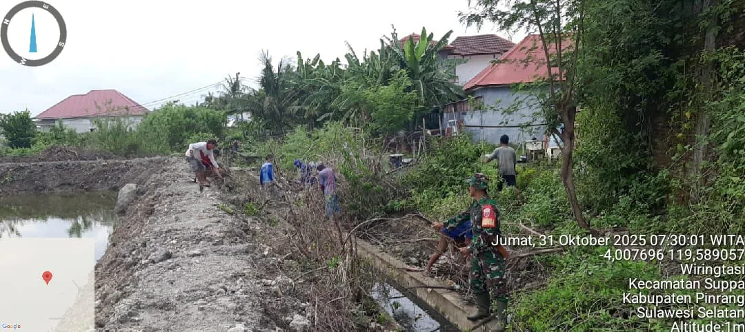 Pinrang_ Menyambut datangnya musim penghujan, personel Koramil 1404-01/Suppa Kodim 1404/Pinrang bersama aparat desa dan masyarakat setempat melaksanakan kerja bakti pembersihan selokan di Dusun Lero B, Desa Wiringtasi, Kecamatan Suppa, Kabupaten Pinrang, Jumat (31/10/2025).