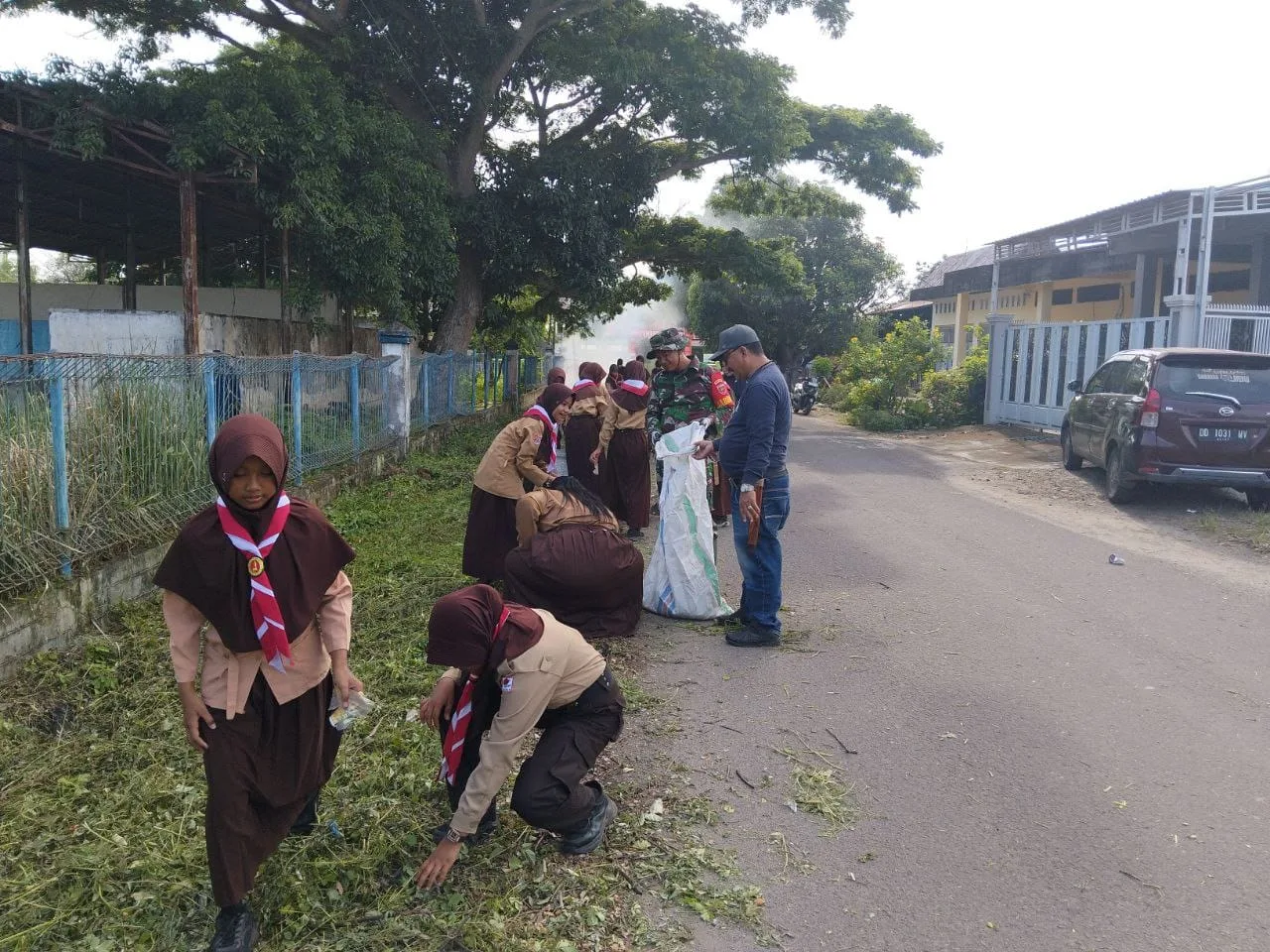 Pinrang_ Koramil 1404-04/Paleteang Kodim 1404/Pinrang melaksanakan kegiatan kerja bakti bersama siswa dan warga dengan sasaran pembersihan sampah dan rumput di kanan dan kiri bahu jalan sepanjang kurang lebih 300 meter. Kegiatan tersebut berlangsung di Kelurahan Temmassarange, Kecamatan Paleteang, Kabupaten Pinrang, Jum’at (12/12/2025).