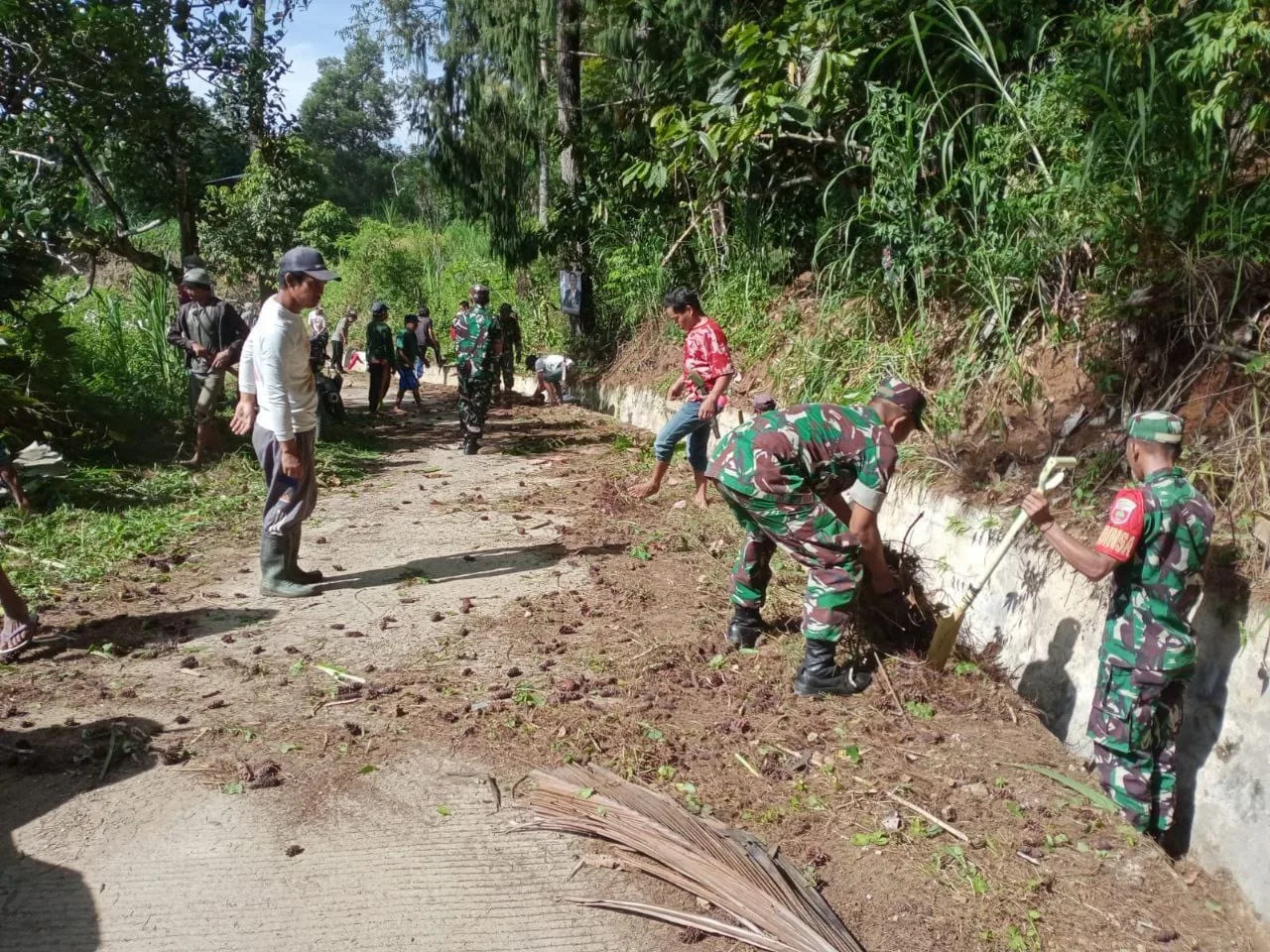 Kegiatan karya bakti tersebut melibatkan personel Koramil 1419-04/Alla bersama aparat desa dan masyarakat setempat. Pembersihan difokuskan pada saluran drainase dan bahu jalan yang mengalami pendangkalan dan pohon yang tumbuh liar yang menggangu pengguna jalan.