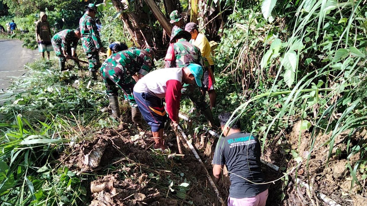 Enrekang — Anggota Koramil 1419-04/Alla bersama pemerintah setempat dan warga Melaksankan karya bakti pembersihan selokan dari tanah, rumput dan sampah lainnya sepanjang 150 meter di Desa Mampu Kec. Anggeraja Kab. Enrekang, Minggu 21/09/2025