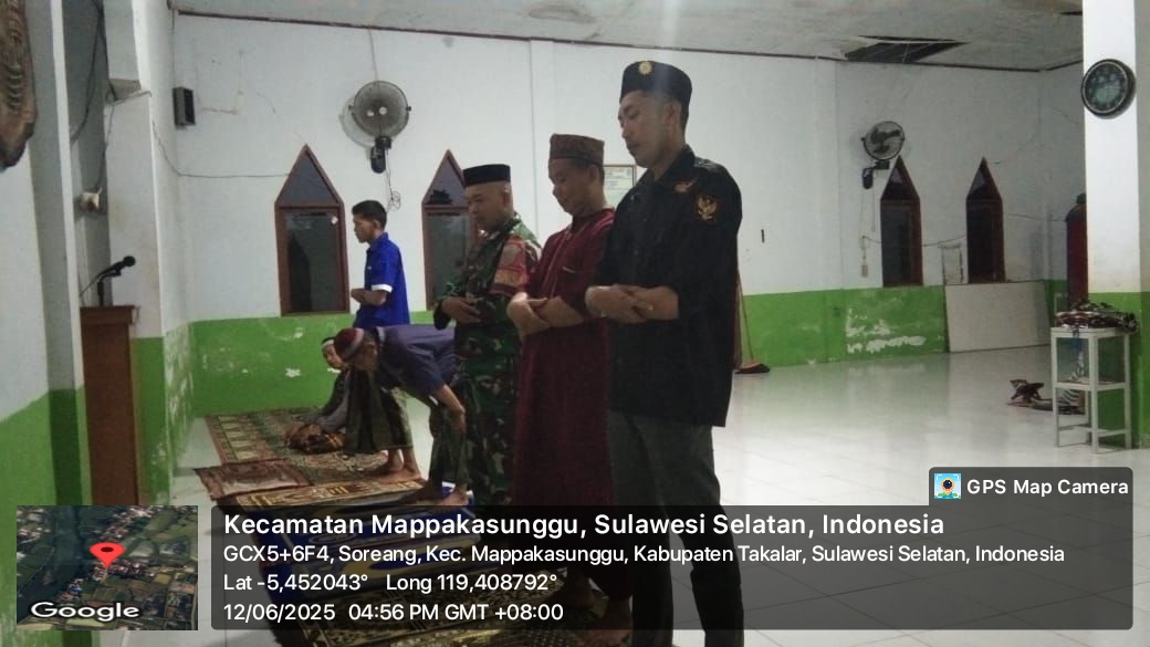 TAKALAR — Tingkatkan keimanan dan ketaqwaan kepada Allah SWT, Personel Koramil 1426-06/Mapsu, Kodim 1426/Takalar, melaksanakan kegiatan safari Sholat Subuh berjamaah dengan menggilir tiga Masjid wilayah binaan kali ini giliran Masjid Nurul Ibrahim, Masjid Nurul Ihsan dan Masjid Nurul Muhajirin Kecamatan Mapsu dan Sanrobone Kabupaten Takalar. Kamis, (12/06/2025)