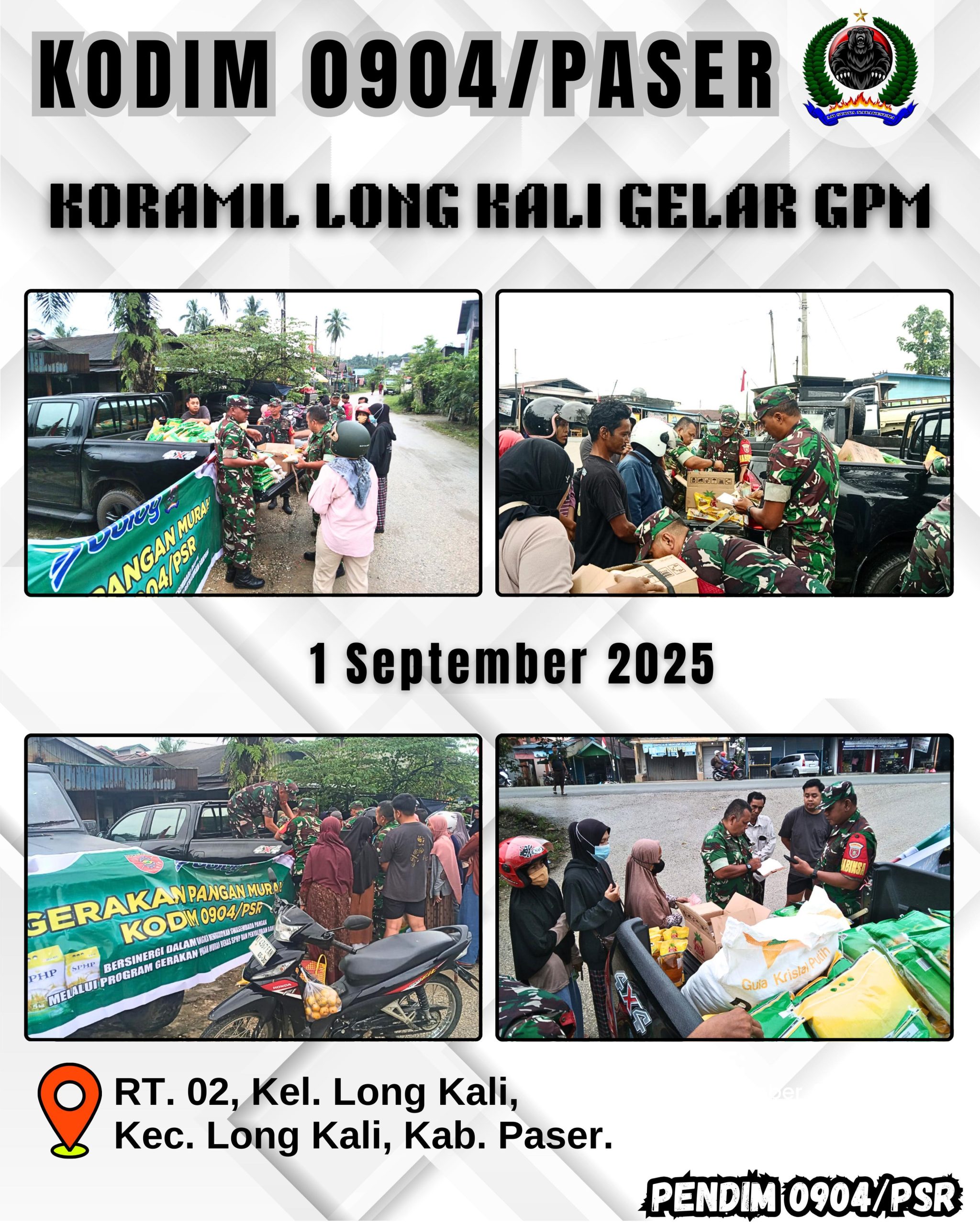 Kodim 0904/Paser, Korem 091/ASN, Kodam VI/Mlw – Dalam rangka Mewujudkan Swasembada Pangan Koramil 0904-03/Long Kali bekerjasama dengan Bulog mengadakan Gerakan Pangan Murah berupa Beras SPHP, Minyak Maykita dan Gula Pasir di RT. 02 Kelurahan Long Kali, Kec.Long Kali, Kab. Paser, Senin (1/9/2025).