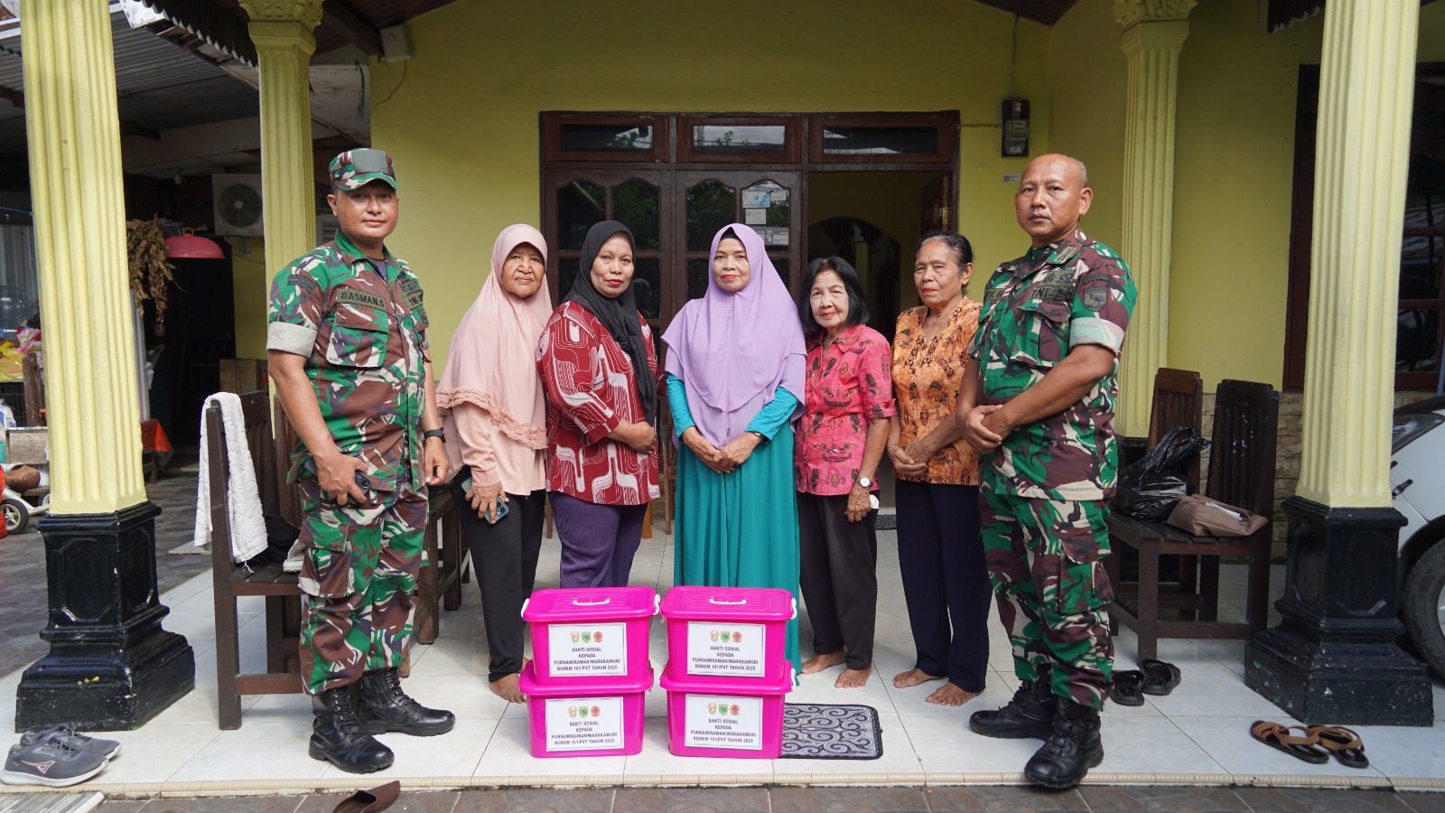 Penyerahan bantuan secara simbolis dilakukan oleh Pasi Komsos Korem 181/PVT, Kapten Inf Rudi Hartono, yang mewakili Komando Resor Militer. Dalam sambutannya, ia menyampaikan harapan agar bantuan yang diberikan dapat memberikan manfaat nyata serta menjadi bentuk perhatian dan kasih sayang dari TNI kepada para sesepuh bangsa.