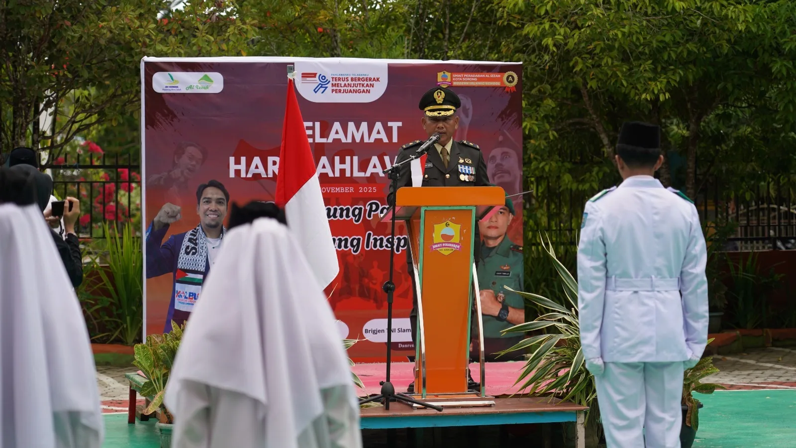 Dalam kesempatan yang sama, ditempat terpisah Periwa Seksi Teritorial Korem 181/PVT Mayor Inf Rudi Hartono mewakili Komandan Korem 181/PVT bertindak sebagai Pembina Upacara dalam rangka peringatan Hari Pahlawan, bertempat di SMAIT Peradaban Al Izzah Kota Sorong, Prov, Papua Barat Daya.