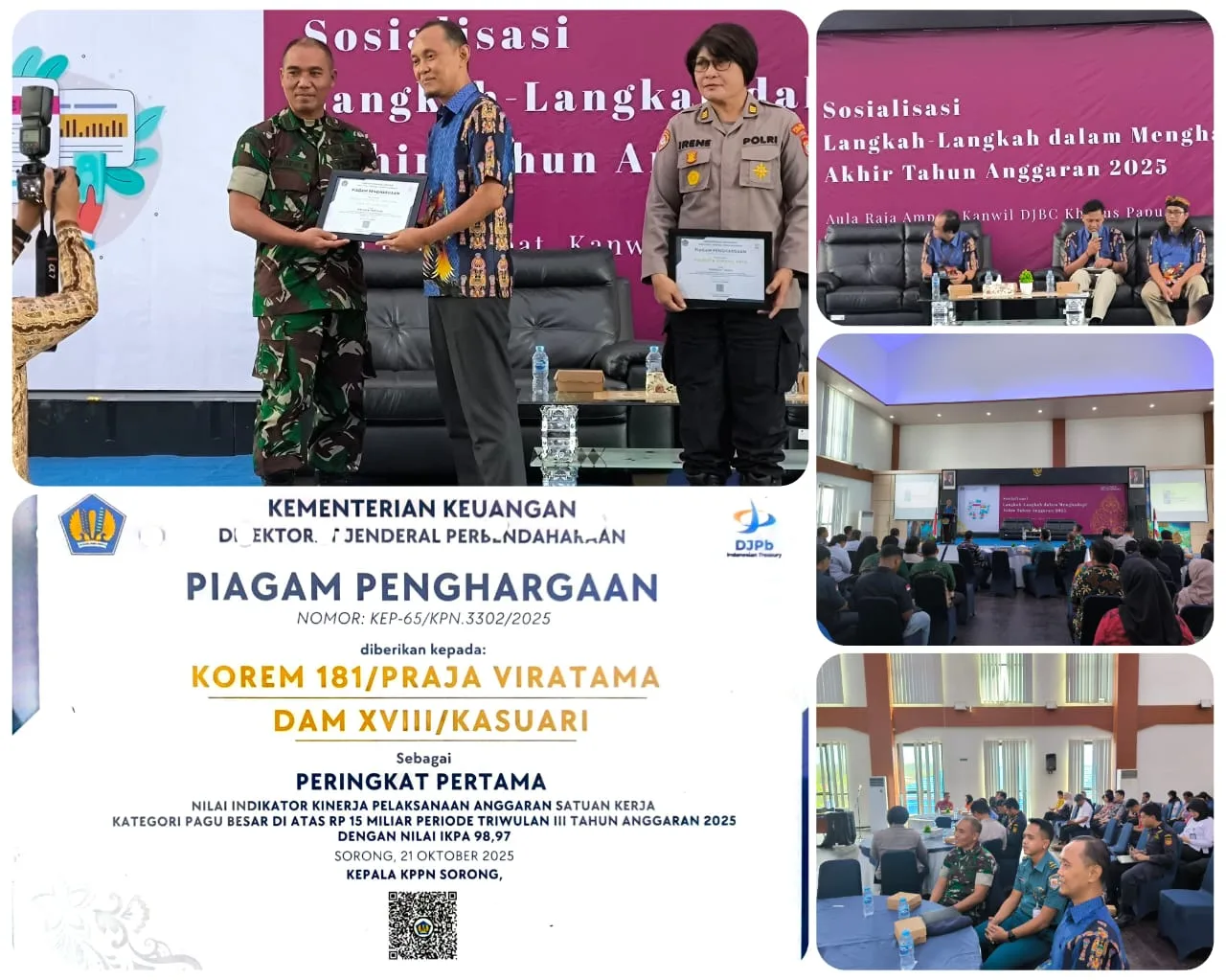 Sorong – Papua Barat Daya, 23 Oktober 2025 — Komando Resor Militer (Korem) 181/Praja Vira Tama (PVT) kembali menorehkan prestasi membanggakan dengan meraih Peringkat 1 Indikator Kinerja Pelaksanaan Anggaran (IKPA) Terbaik kategori Pagu Besar (di atas 15 Miliar Rupiah) untuk Triwulan III Tahun Anggaran 2025.