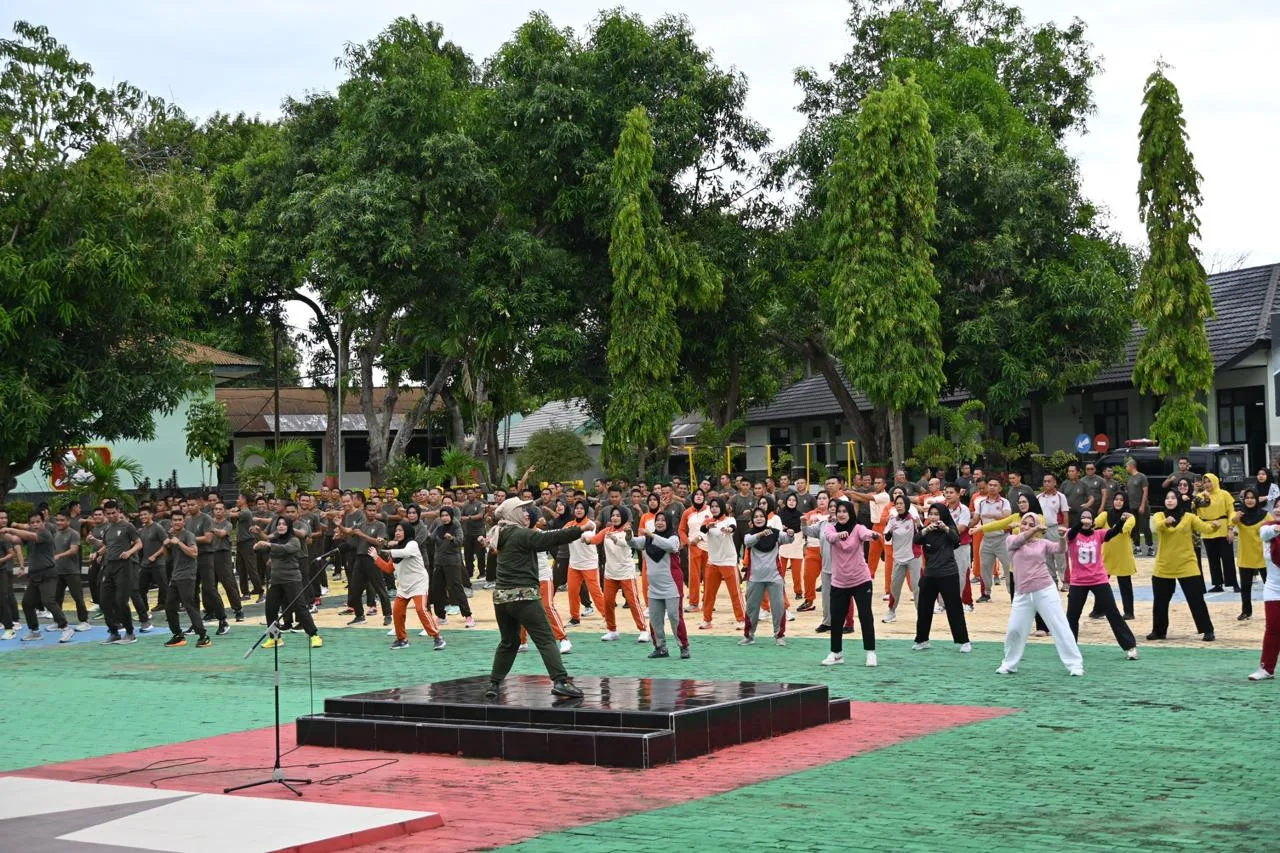 Setelah kegiatan apel dan yel-yel, seluruh prajurit melanjutkan kegiatan senam bersama Persit KCK Koorcab Rem 141.