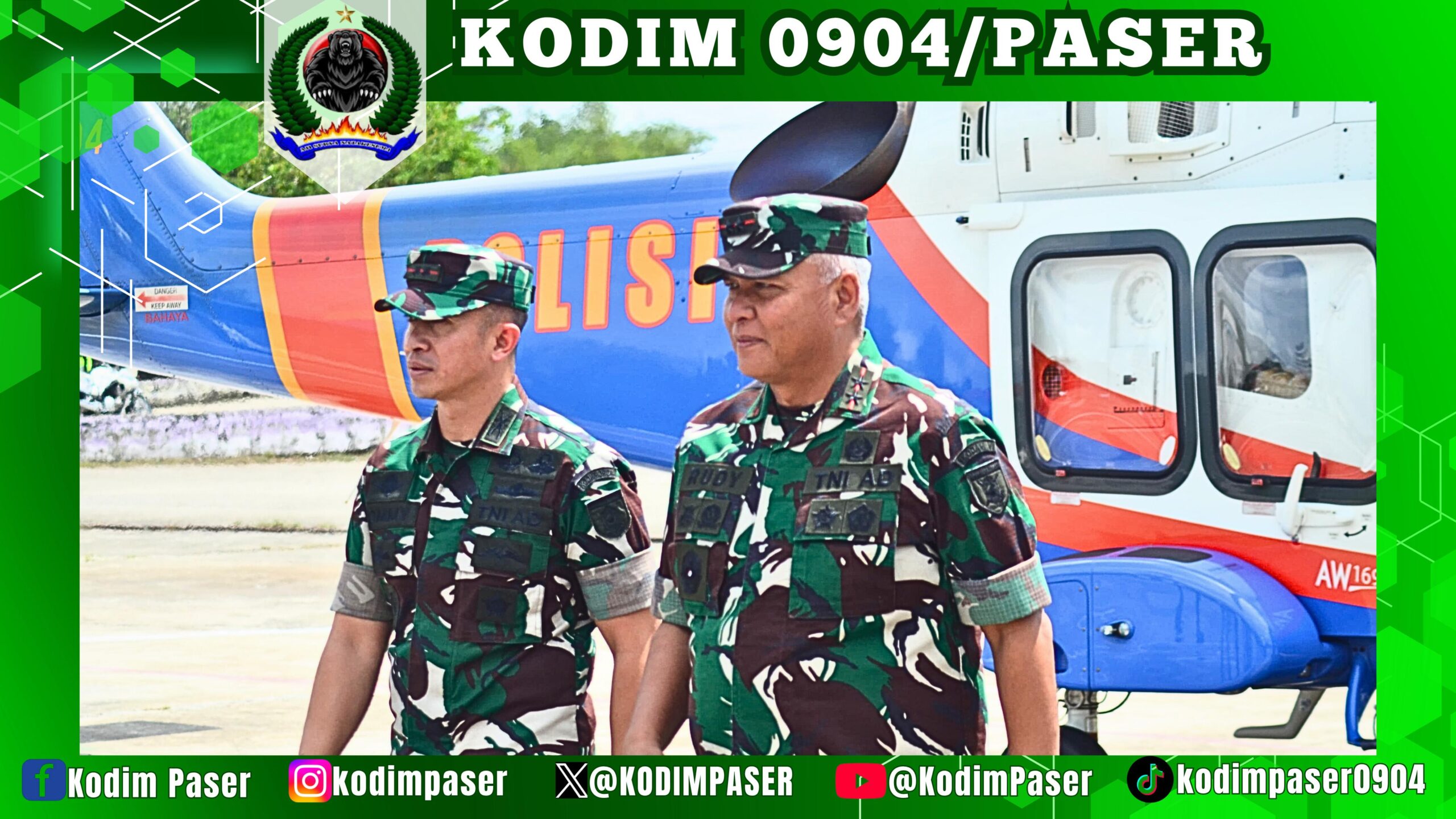 Kodim 0904/Psr, Korem 091/ASN, Kodam VI/Mlw – Pada hari Jumat tanggal 13 Juni 2025 Pukul 11.30 Wita Komandan Kodim 0904/Psr, Letnan Kolonel Inf. Rommy Aditya Nanda Erlambang Eretan Situlembang Darmawi, S.E., M.I.P. menyambut kedatangan Pangdam VI/Mlw, Mayjen TNI Rudy Rachmat Nugraha, S.I.P., M.Sc. beserta Forkopimda Kaltim di wilayah Kab. Paser menggunakan Helly Type AW 169/P-3304 yang bertempat di Lapangan Gentung Temiyang Jln. Kesuma Bangsa KM. 05 Desa Tepian Batang Kec. Tanah Grogot Kab. Paser. Jumat (13/6/2025)