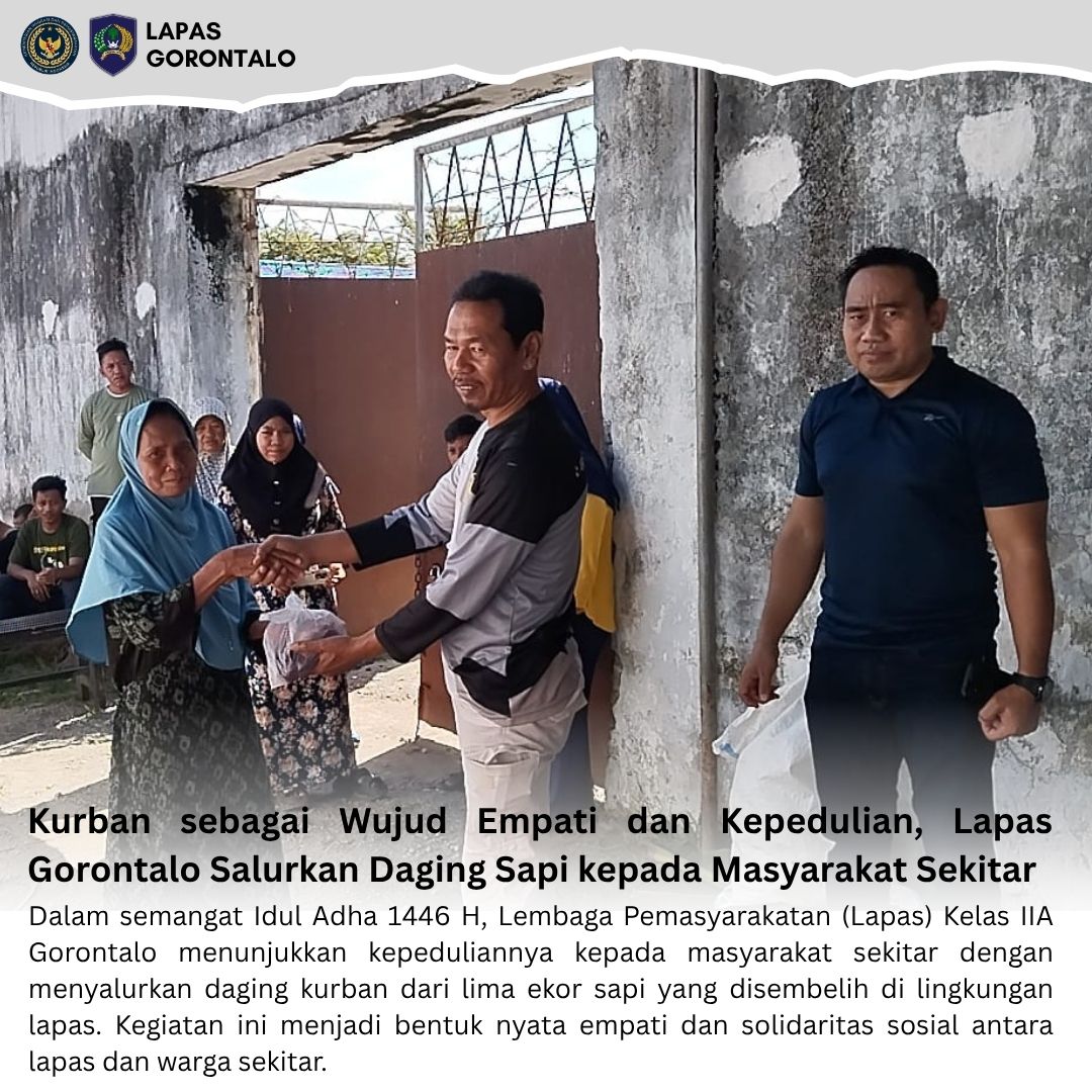 Gorontalo – INFO_PAS – Dalam semangat Idul Adha 1446 H, Lembaga Pemasyarakatan (Lapas) Kelas IIA Gorontalo menunjukkan kepeduliannya kepada masyarakat sekitar dengan menyalurkan daging kurban dari lima ekor sapi yang disembelih di lingkungan lapas. Kegiatan ini menjadi bentuk nyata empati dan solidaritas sosial antara lapas dan warga sekitar.