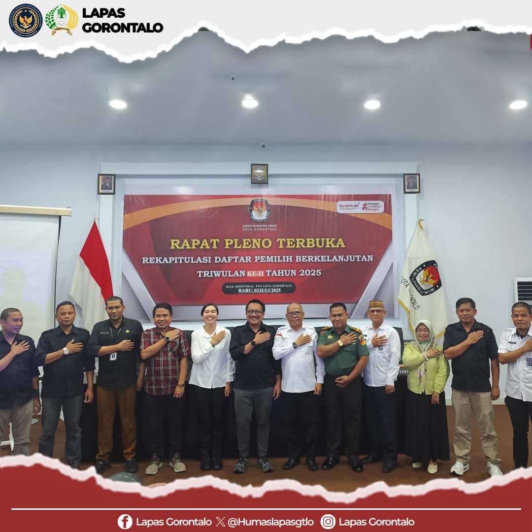Gorontalo – INFO_PAS – Lembaga Pemasyarakatan (Lapas) Kelas IIA Gorontalo turut serta dalam kegiatan Rapat Pleno Terbuka Rekapitulasi Daftar Pemilih Tetap (DPT) Berkelanjutan Triwulan II Tahun 2025, yang diselenggarakan oleh Komisi Pemilihan Umum (KPU) Kota Gorontalo pada Rabu, 2 Juli 2025, bertempat di Aula Mootinelo, Kantor KPU Kota Gorontalo, mulai pukul 14.00 WITA hingga selesai.