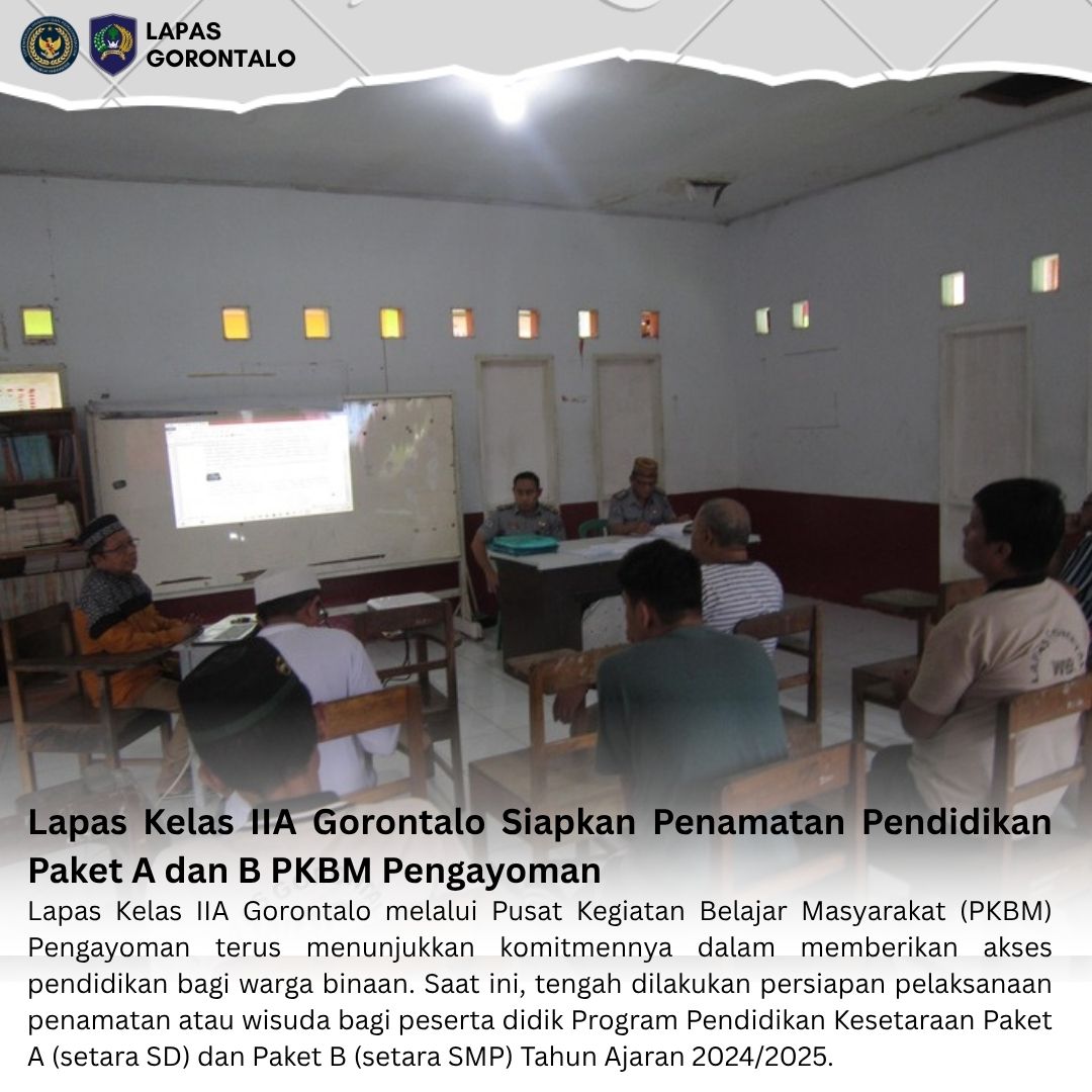 Gorontalo – INFO_PAS – Lapas Kelas IIA Gorontalo melalui Pusat Kegiatan Belajar Masyarakat (PKBM) Pengayoman terus menunjukkan komitmennya dalam memberikan akses pendidikan bagi warga binaan. Saat ini, tengah dilakukan persiapan pelaksanaan penamatan atau wisuda bagi peserta didik Program Pendidikan Kesetaraan Paket A (setara SD) dan Paket B (setara SMP) Tahun Ajaran 2024/2025.