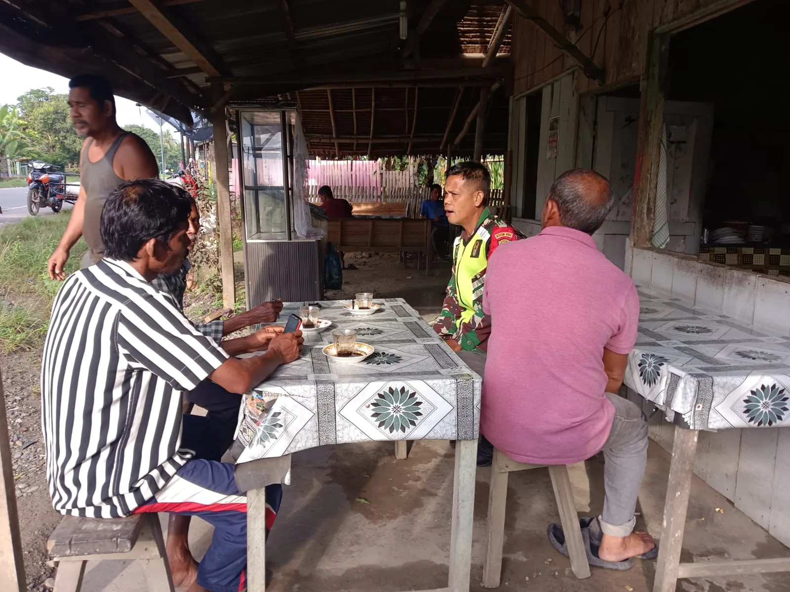 Melalui perbincangan ringan, Babinsa menggali berbagai informasi terkait kondisi sosial, keamanan, serta dinamika kehidupan masyarakat sehari-hari.