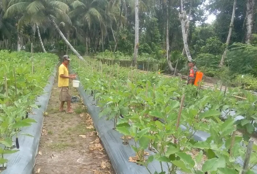 Babinsa Koramil 05/Simeulue Barat, Kodim 0115/Simeulue, Korem 012/Teuku Umar. Serda Megi Juanda melaksanakan penyemprotan kebun terong untuk meminimalisir serangan hama di Desa Layabaung, Kecamatan Simeulue barat, Kabupaten Simeulue. Senin (13/10/2025).