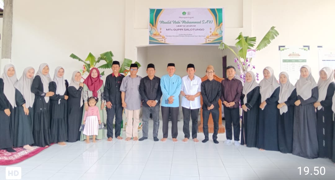 MTs Guppi Salotungo mengadakan peringatan Maulid Nabi Besar Muhammad SAW dengan suasana penuh khidmat. Kegiatan ini dihadiri oleh sejumlah tokoh penting, di antaranya Pengawas Madrasah Muhammad As’ad, M.Pd., Drs. H. Alimin, M.Pd., serta Penyuluh Senior Azriana, S.Ag., M.Pd.I.