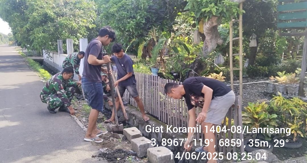 Anggota Koramil-08/Lanrisang bekerjasama dengan warga masyarakat membersihkan saluran air ditepi jalan yang mengalami pendangkalan karena sampah dan tanah, serta ditumbuhi rumput liar.