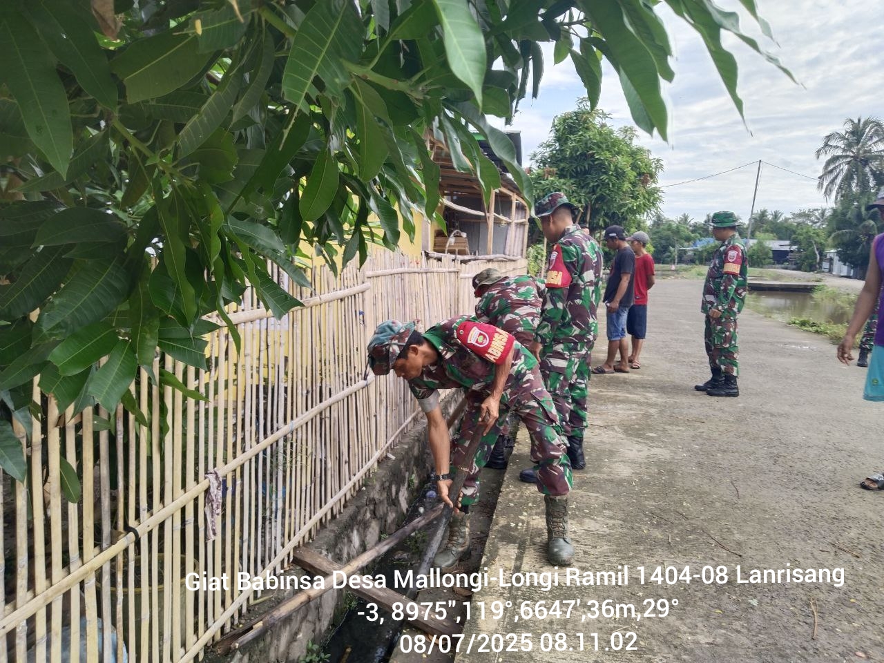 Pinrang_ Anggota Koramil-08/Lanrisang Kodim 1404/Pinrang bersama warga melaksanakan kerja bakti pembersihan saluran air di Dusun Kanari Desa Mallongi-longi Kecamatan Lanrisang Kabupaten Pinrang, Selasa (08/07/2025).