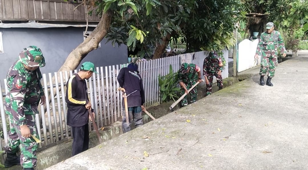 Babinsa Koramil-08/Lanrisang bekerjasama dengan warga membersihkan saluran air ditepi jalan yang mengalami pendangkalan karena sampah dan tanah, serta ditumbuhi rumput liar.