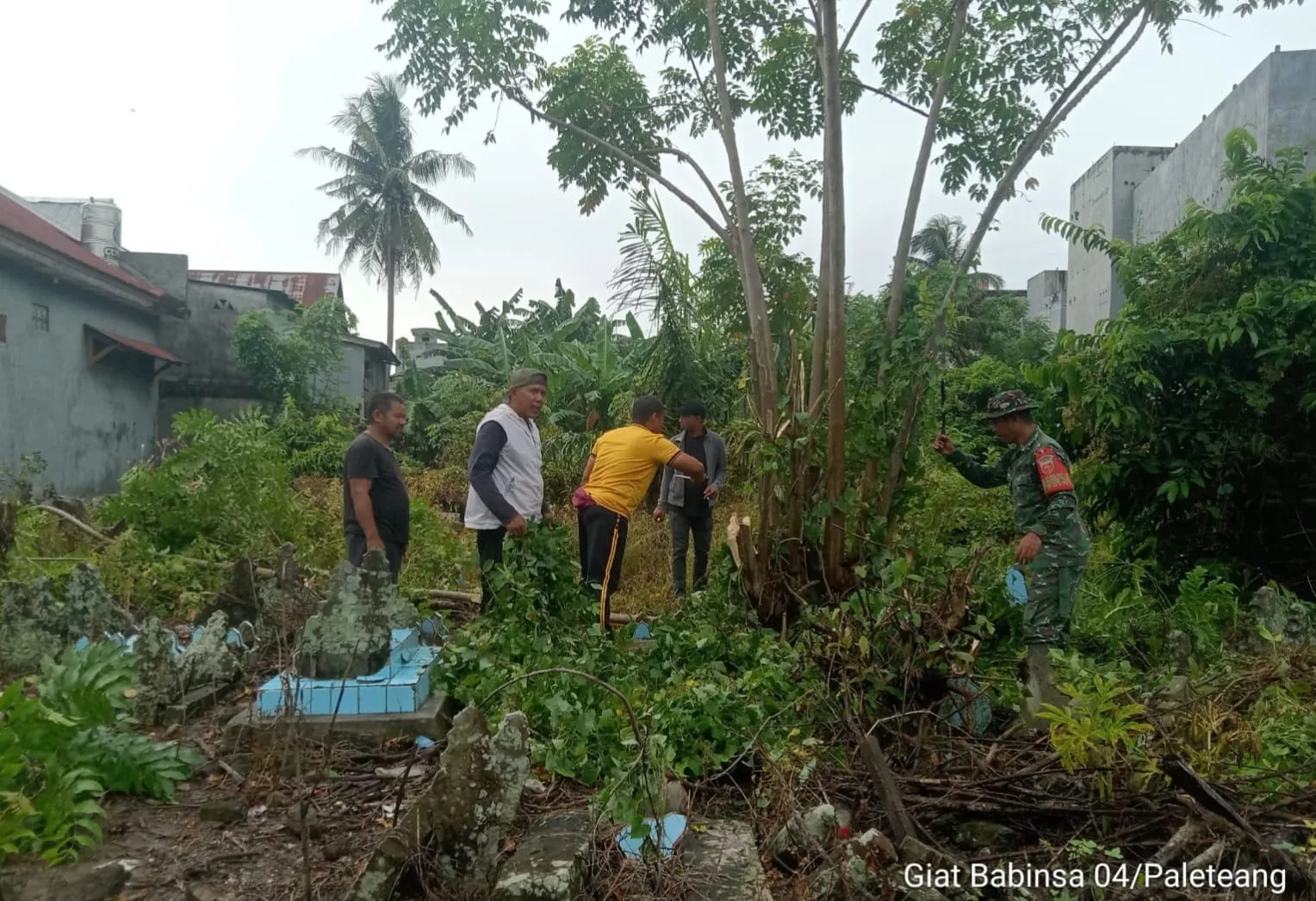 Pinrang_ Babinsa Koramil 1404-04/Paleteang Kodim 1404/Pinrang Sertu Abbas Mangungsara melaksanakan kegiatan kerja bakti bersama masyarakat dengan sasaran pembersihan Tempat Pemakaman Umum (TPU) yang berada di Kelurahan Pacongang, Kecamatan Paleteang, Kabupaten Pinrang, Jum’at (06/03/2026).