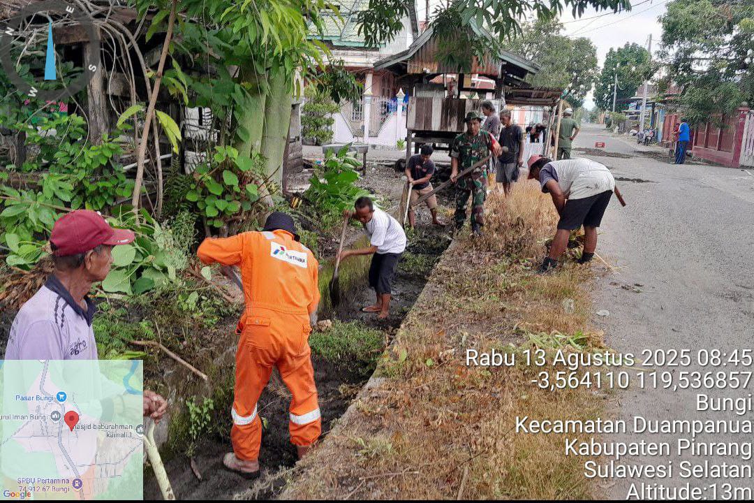 Pinrang_ Sebagai bentuk kepedulian terhadap kebersihan Lingkungan, Babinsa Koramil-06/Duampanua Kodim 1404/Pinrang Serka Hamsir mengajak warga melaksanakan kerja bakti membersihkan saluran air di Dusun Susbater Desa Bungi Kecamatan Duampanua Kabupaten Pinrang, Rabu (13/08/2025).