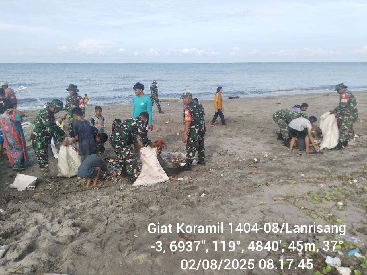 Pinrang_ Peduli terhadap kebersihan pantai, Babinsa Koramil-08/Lanrisang Kodim 1404/Pinrang bersama warga melaksanakan aksi bersih-bersih pantai di Lingkungan Kassi Kelurahan Lanrisang Kecamatan Lanrisang Kabupaten Pinrang, Sabtu (02/08/2025).