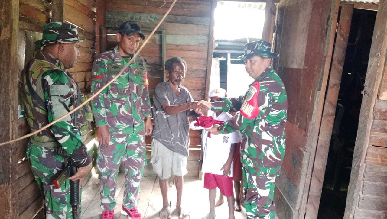 Bibida ~ Danramil 1703-01/Enarotali, Kapten Inf Eko Warsito bersama Babinsa Kampung Kolaitaga, berbagi kebahagiaan dengan memberikan bantuan Seragam Sekolah kepada anak-anak di Kp. Kolaitaga, Distrik Bibida, Kab. Paniai, Prov. Papua Tengah, (08/08/2025).