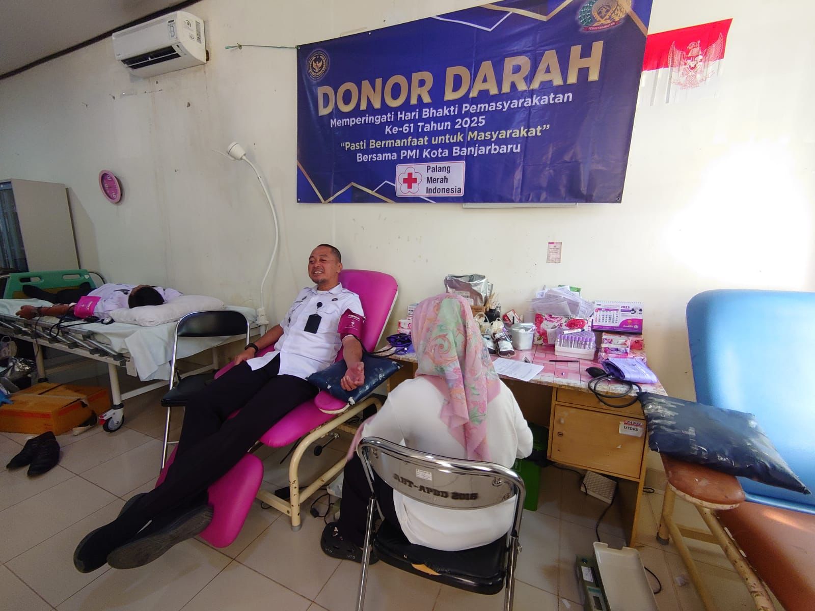 Banjarbaru, INFO_PAS – Lembaga Pemasyarakatan (Lapas) Kelas IIB Banjarbaru gelar kegiatan donor darah dalam rangka peringatan Hari Bakti Pemasyarakatan (HBP) Ke-61, Rabu (16/4). Kegiatan tersebut bekerja sama dengan Unit Transfusi Darah (UTD) Rumah Sakit Daerah (RSD) Idaman Kota Banjarbaru.