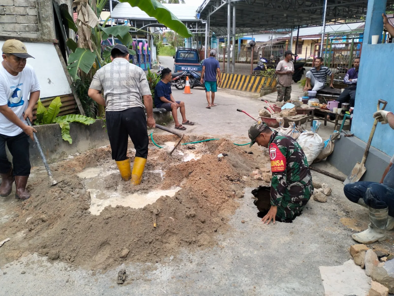 Dengan penuh semangat Kebersamaan antara Babinsa dan masyarakat terlihat sangat kompak saat menggarap perbaikan jalan dan parit yang rusak akibat longsor mewujudkan terciptanya kemanunggalan TNI dan rakyat.