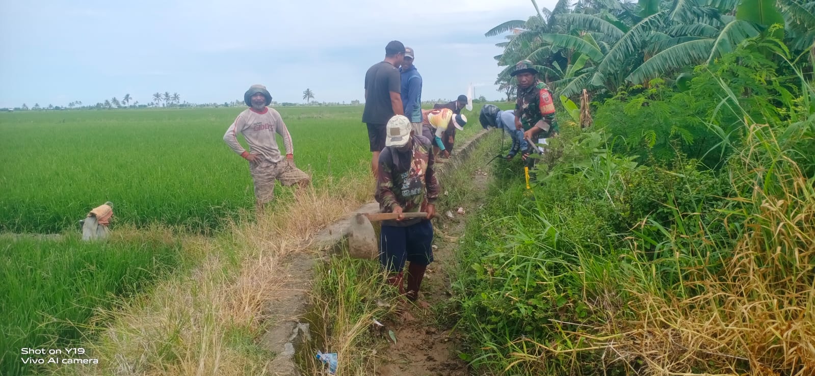 Pinrang_ Untuk mendukung kebutuhan air bagi para petani, Babinsa jajaran Koramil-02/Mattiro Sompe Kodim 1404/Pinrang bersama warga membersihkan saluran irigasi pengairan di Dusun Katteong Desa Samaenre Kecamatan Mattiro Sompe Kabupaten Pinrang, Sabtu (12/04/2025).